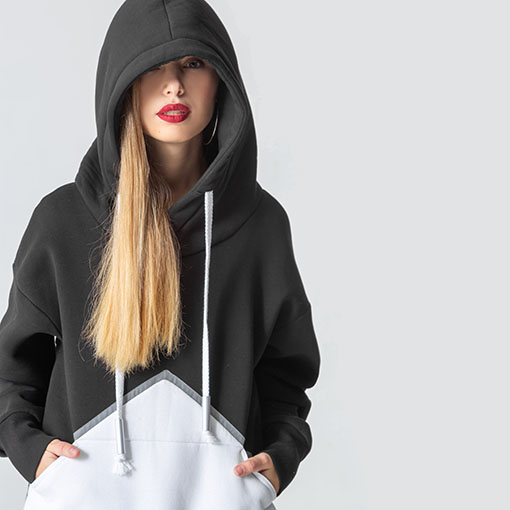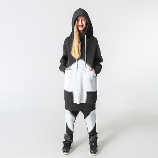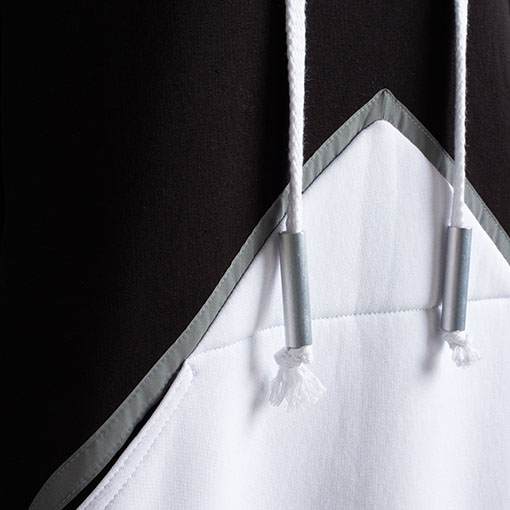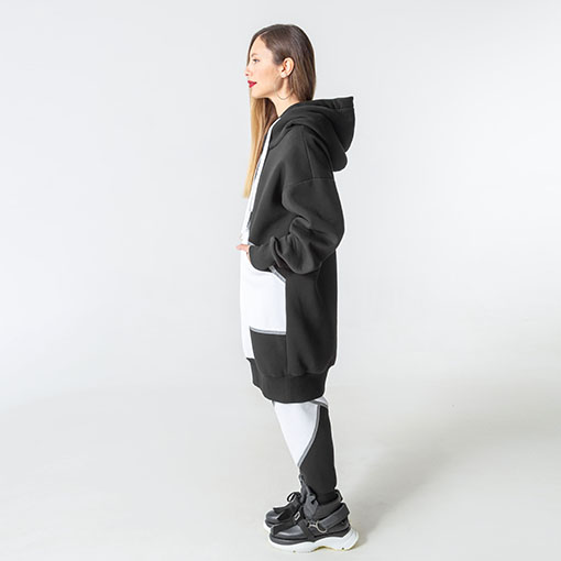 Oversize long hoodie that can be worn as an independent dress. Has pockets & is ribbed on the cuffs and bottom. Constructed with arrow graphic form on them decorated with light reflecting stripes.