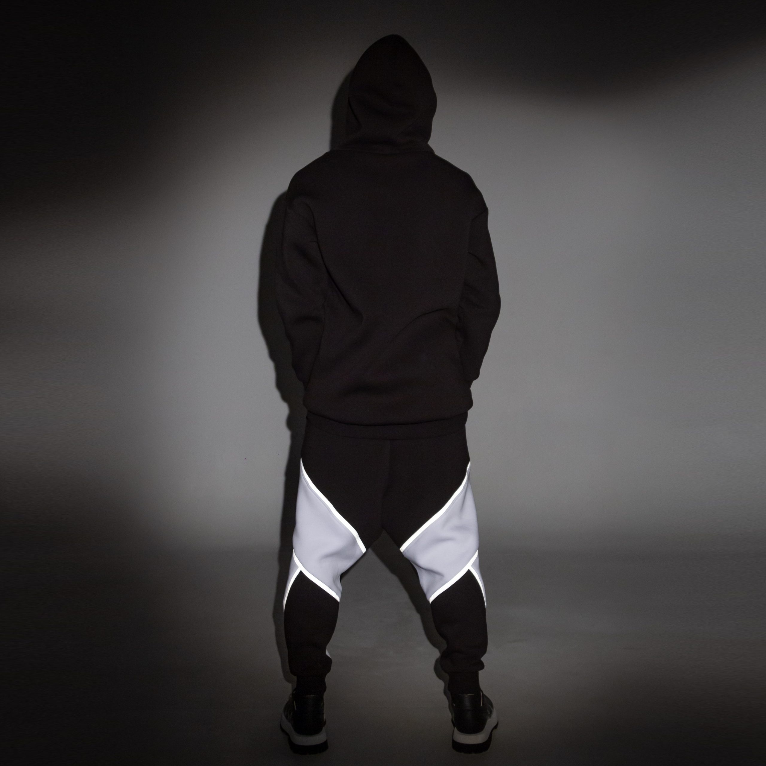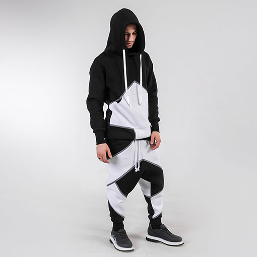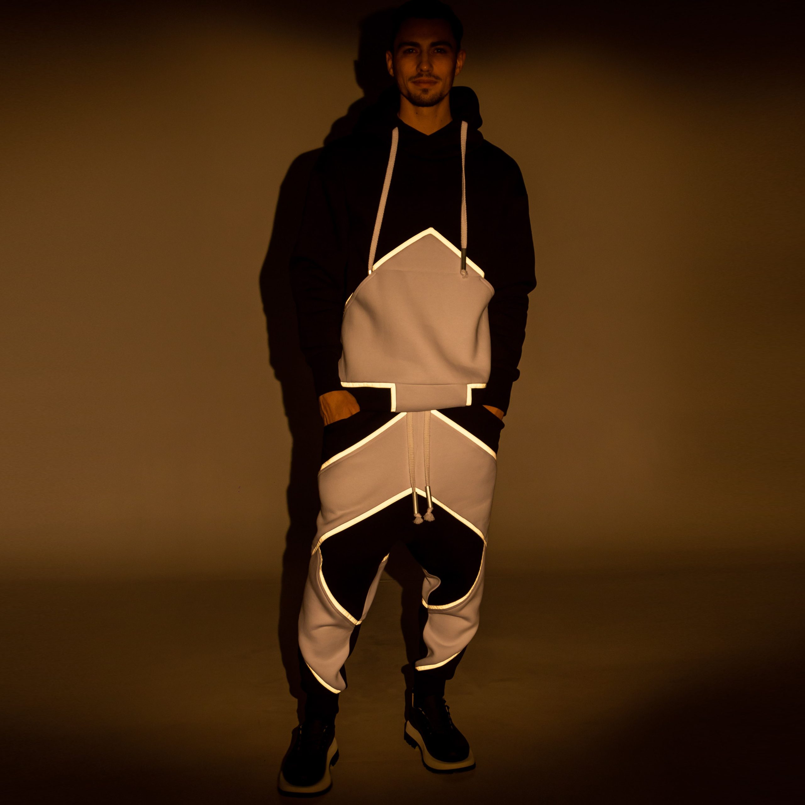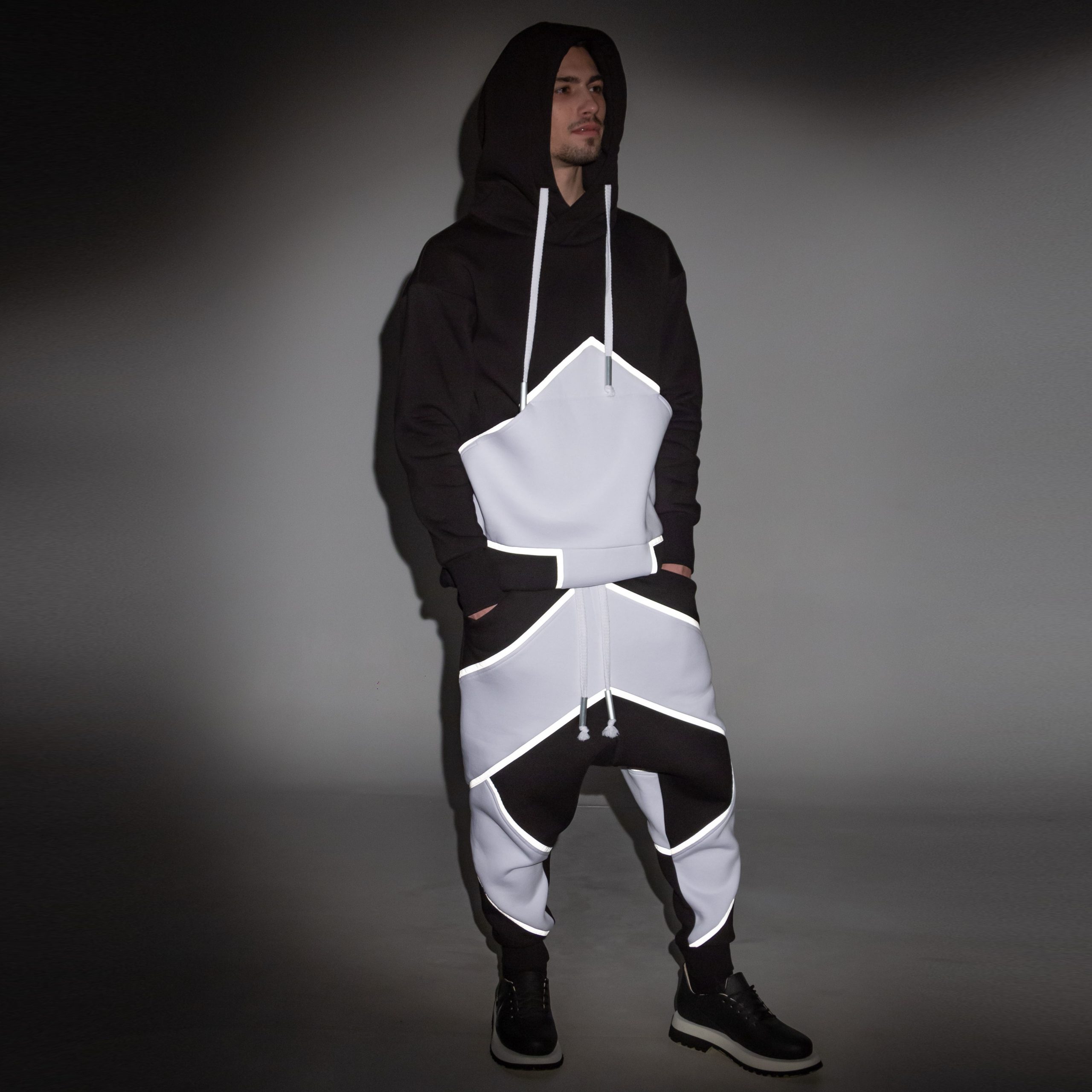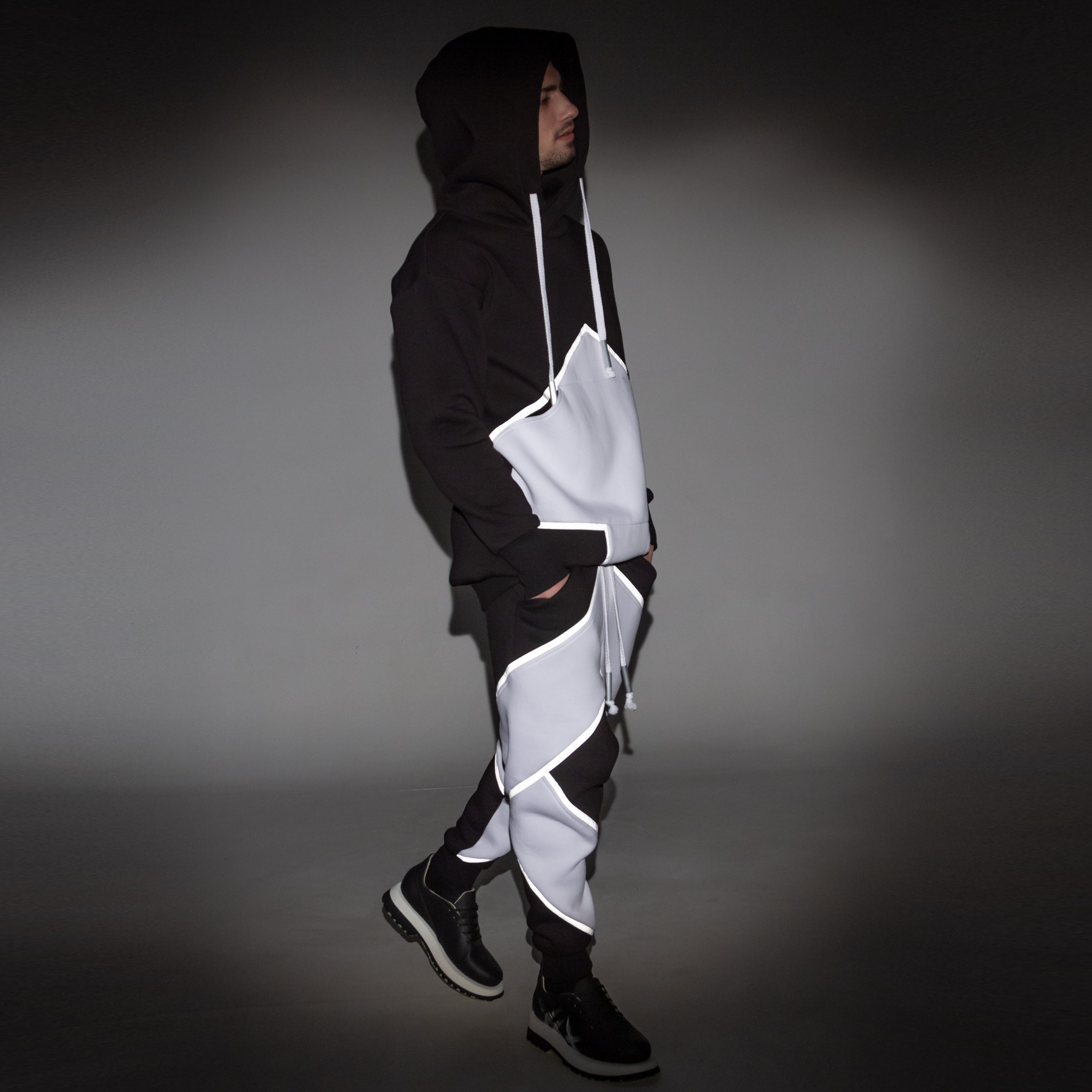 Oversize unisex sweat suit with long hoodie & pants. Ribbed on the cuffs and bottom. Both constructed with arrow graphic form on them decorated with light reflecting stripes.