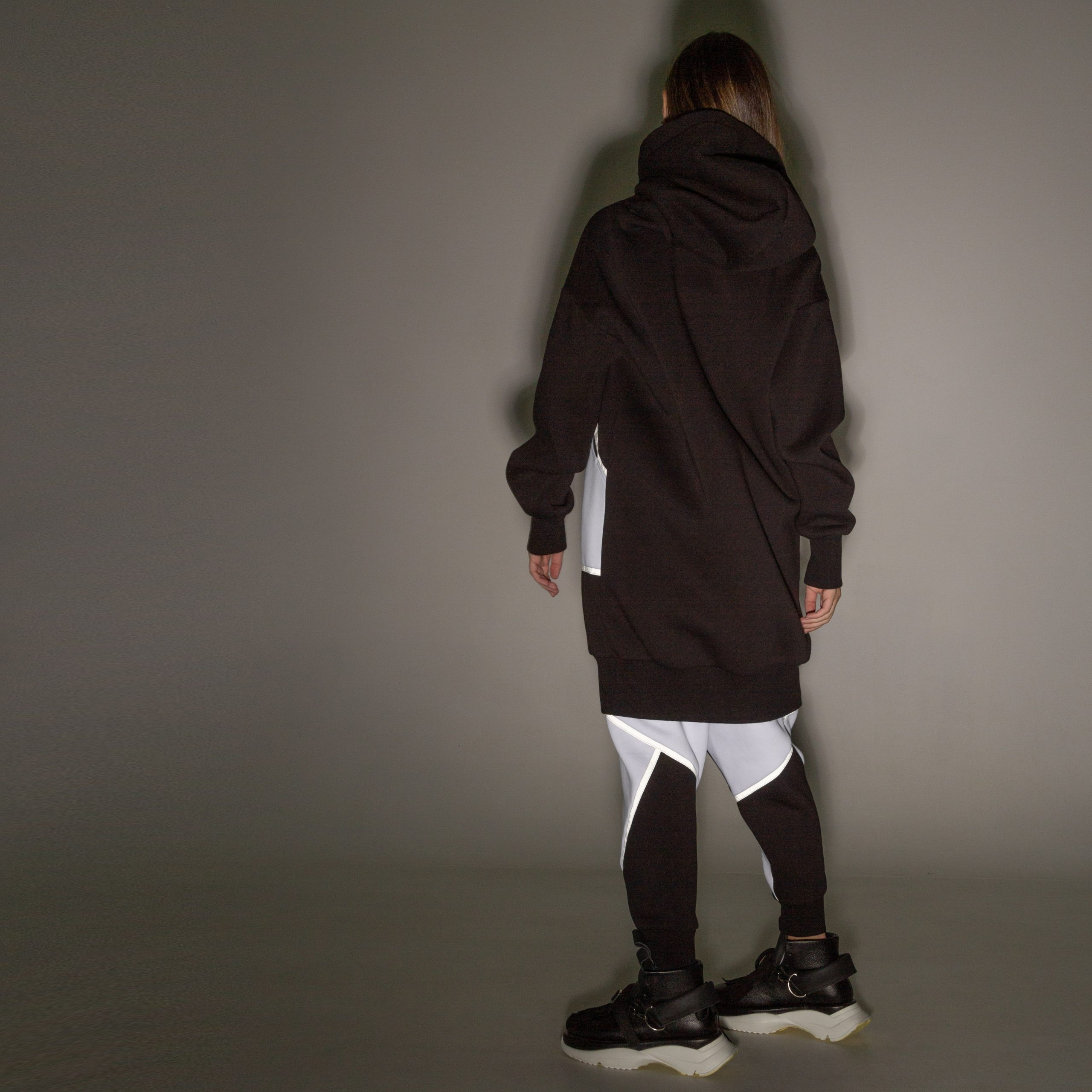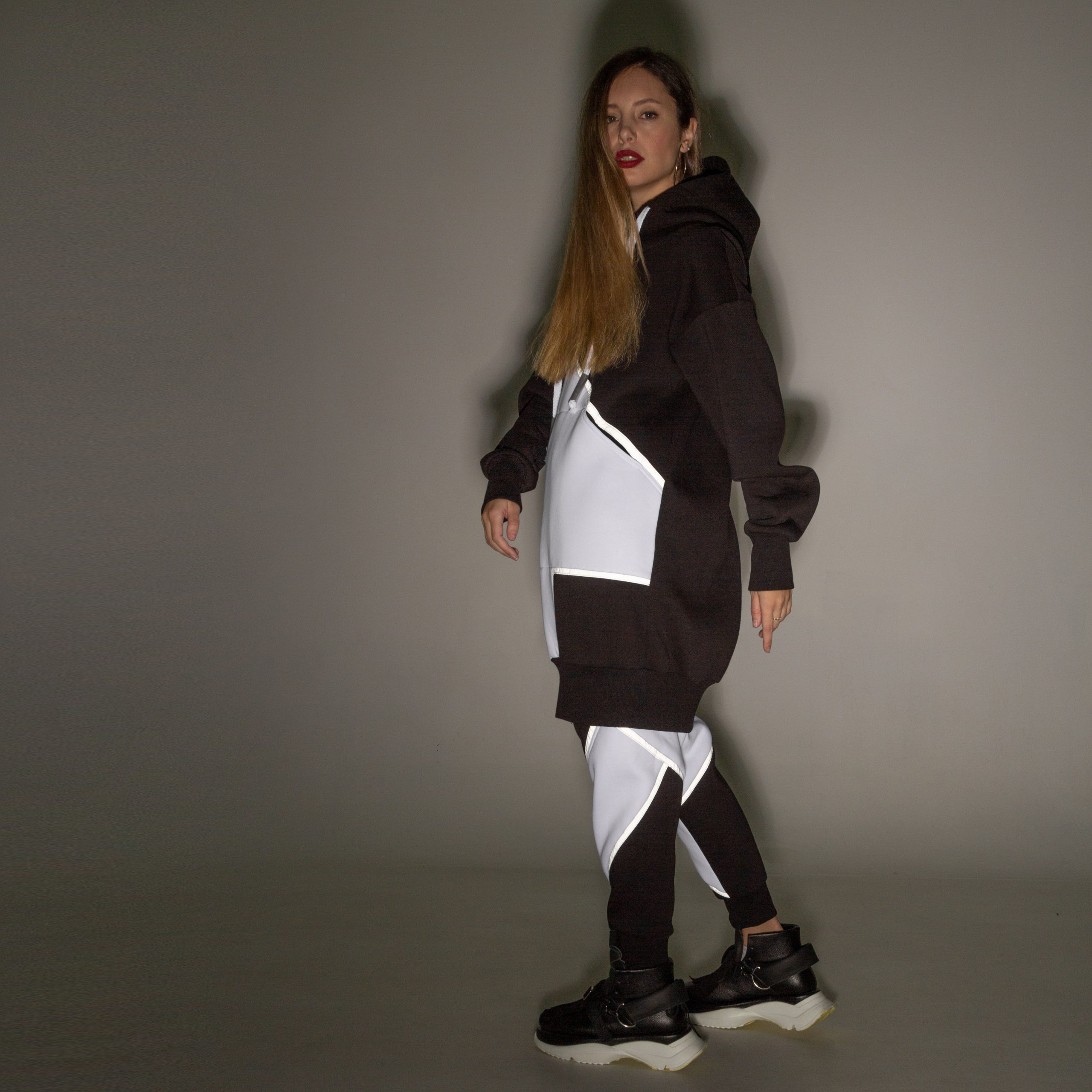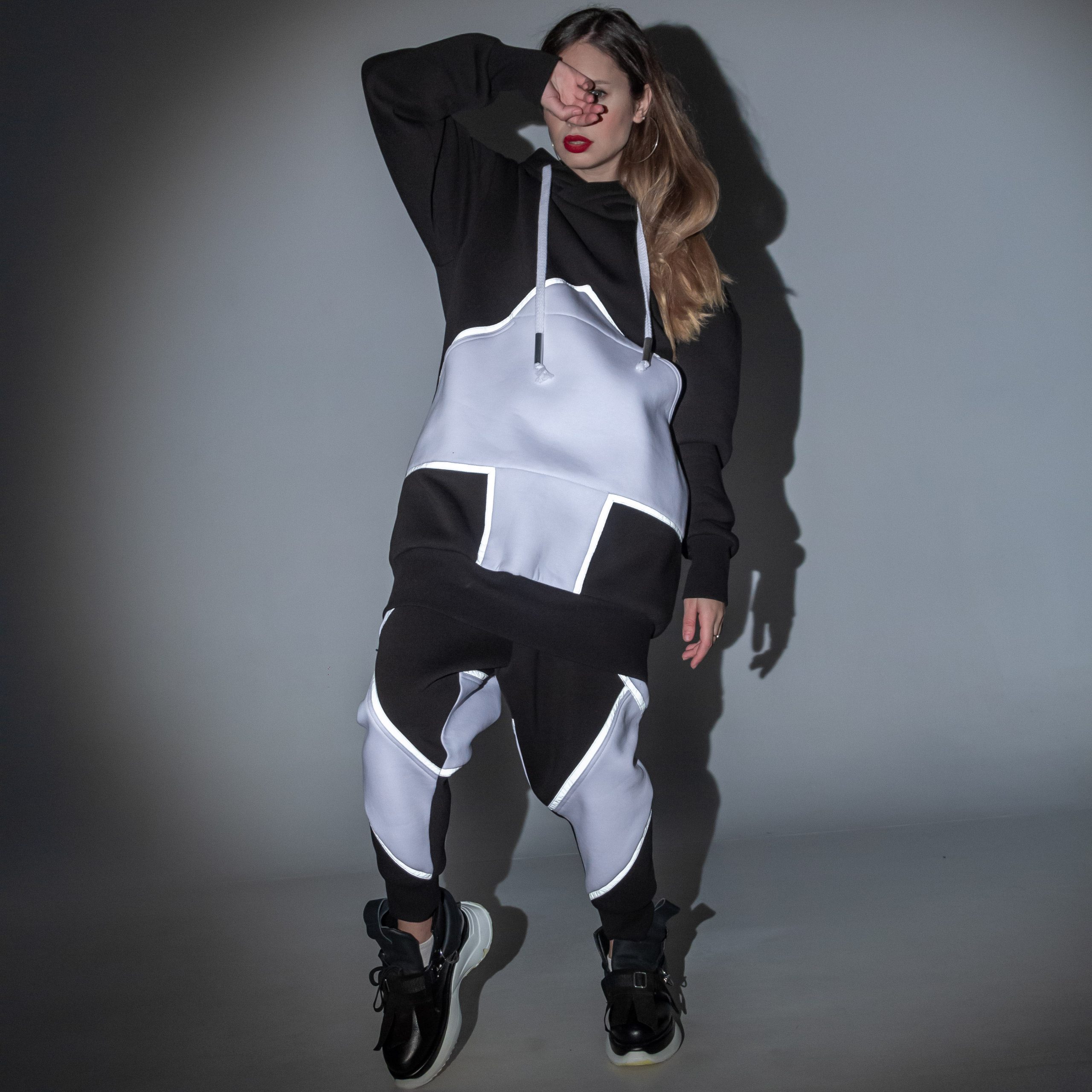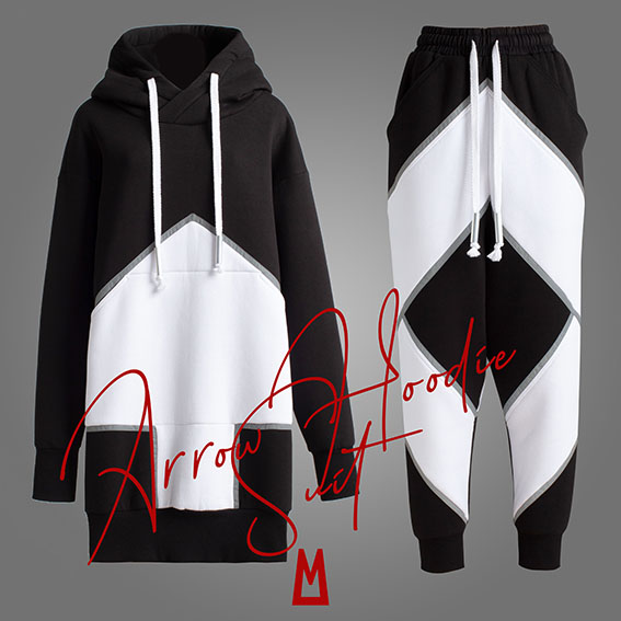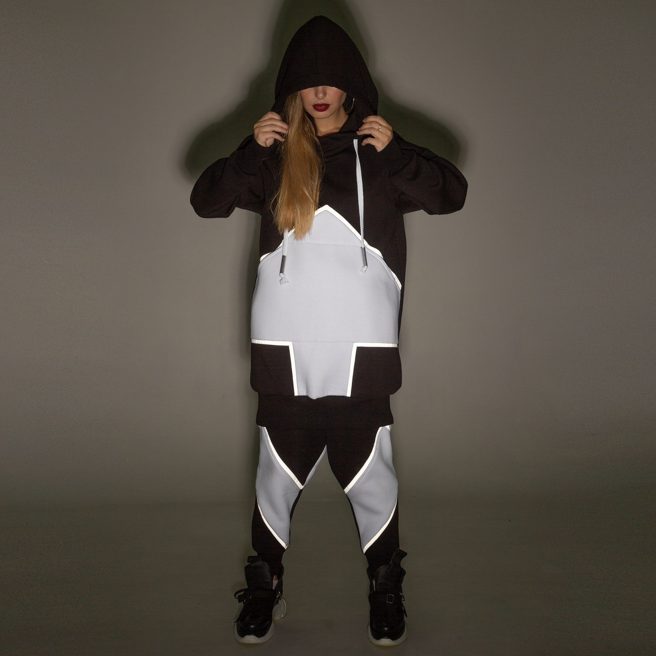 Oversize unisex sweat suit with long hoodie & pants. Ribbed on the cuffs and bottom. Both constructed with arrow graphic form on them decorated with light reflecting stripes.
