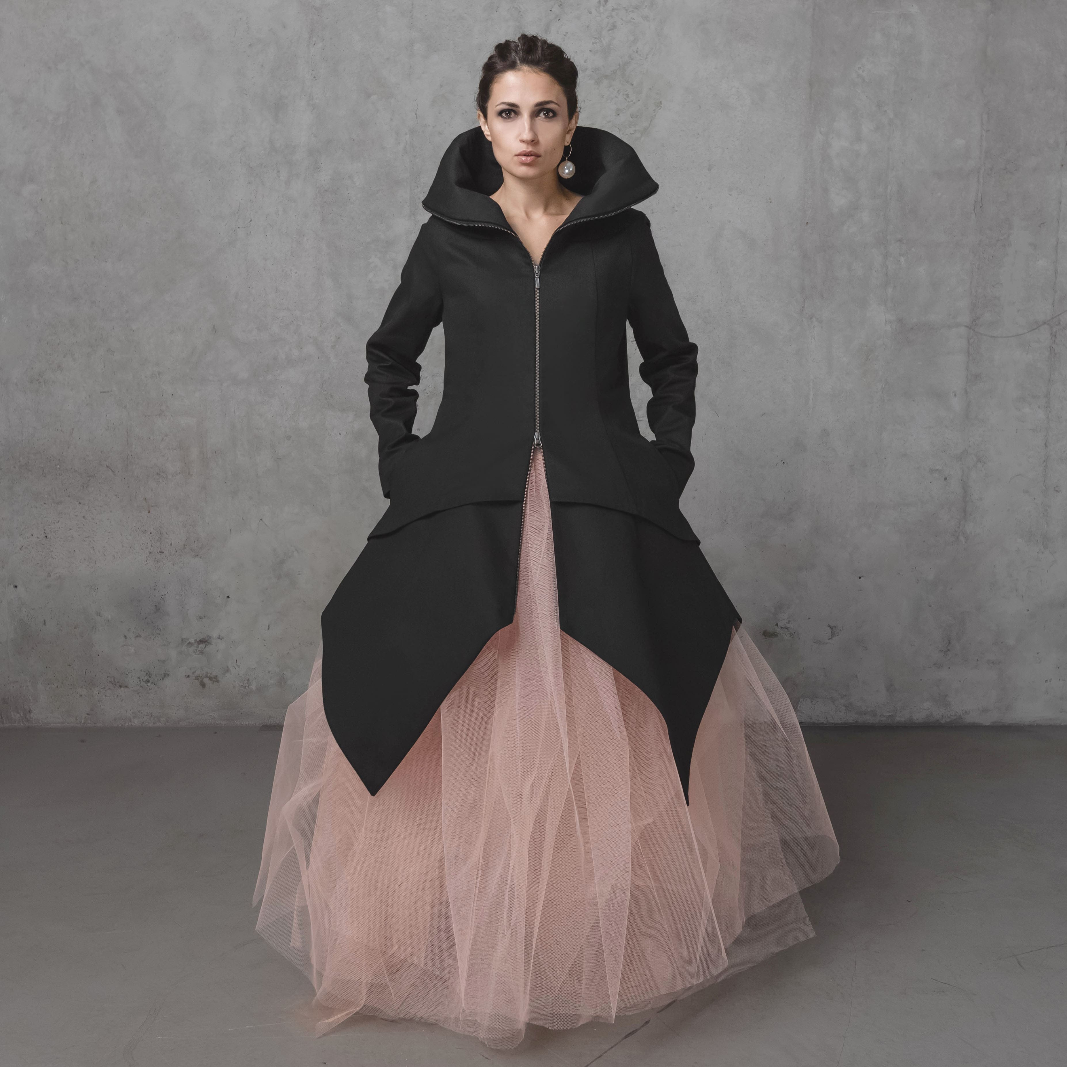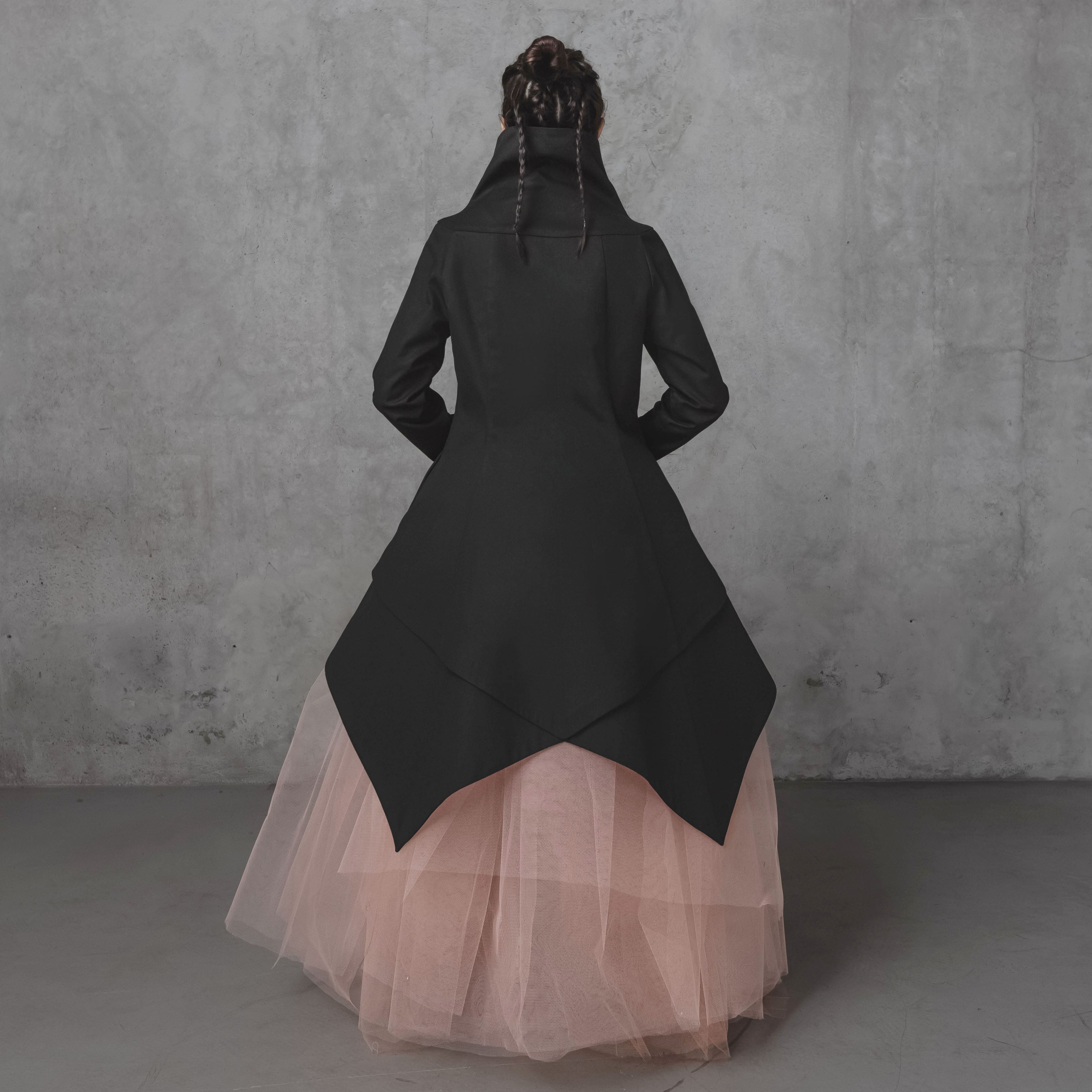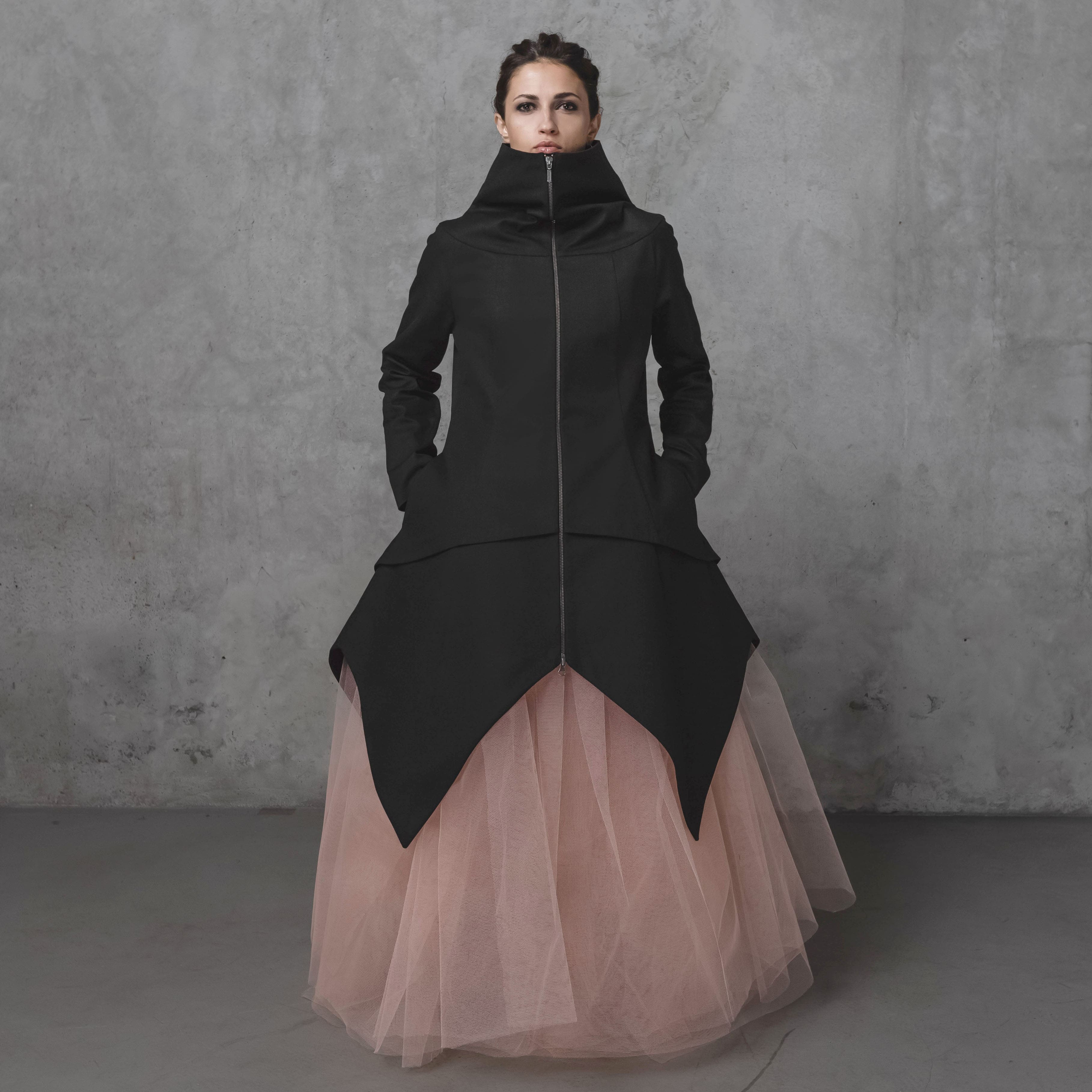 High collar sculptural jacket made in heavy cotton with thin cotton lining.