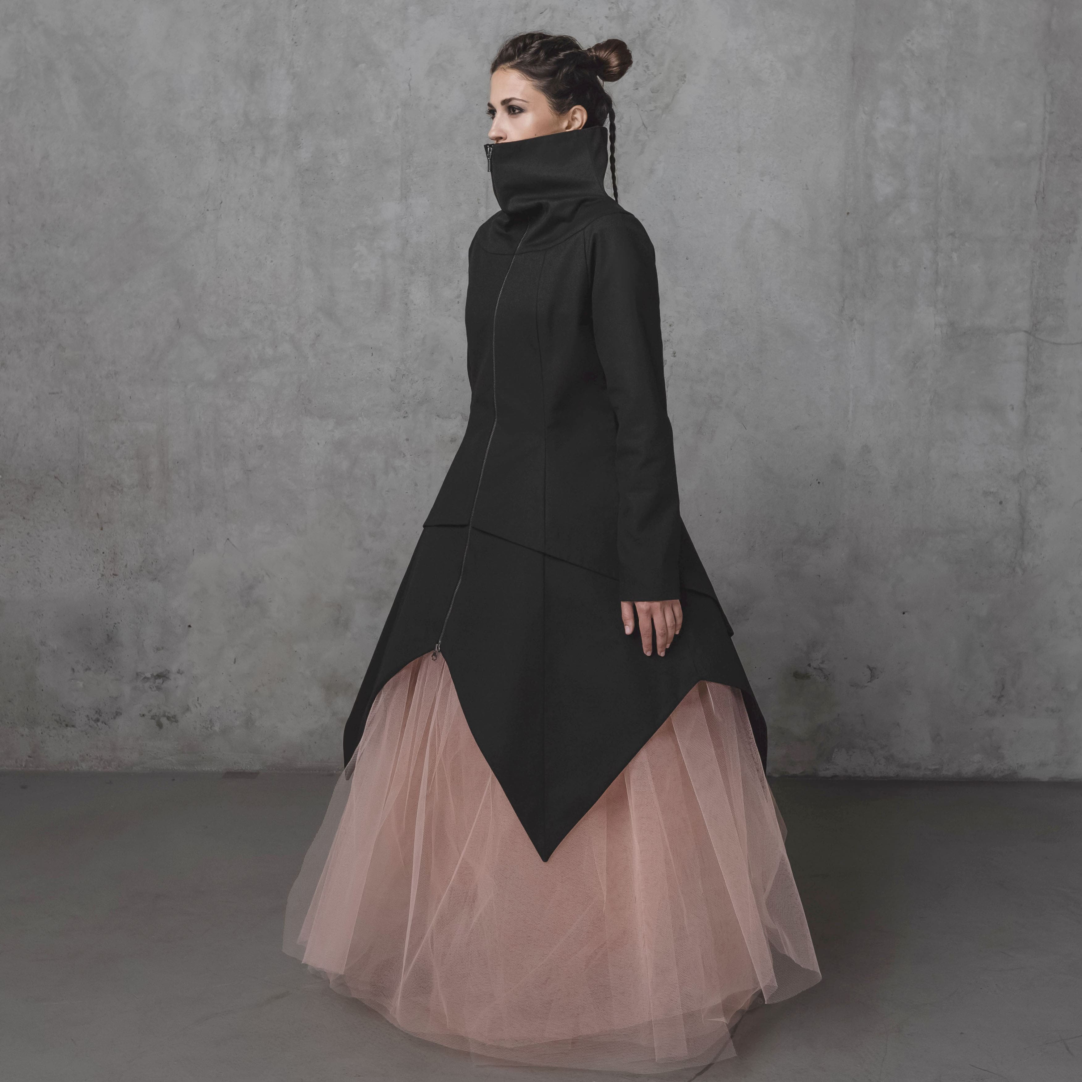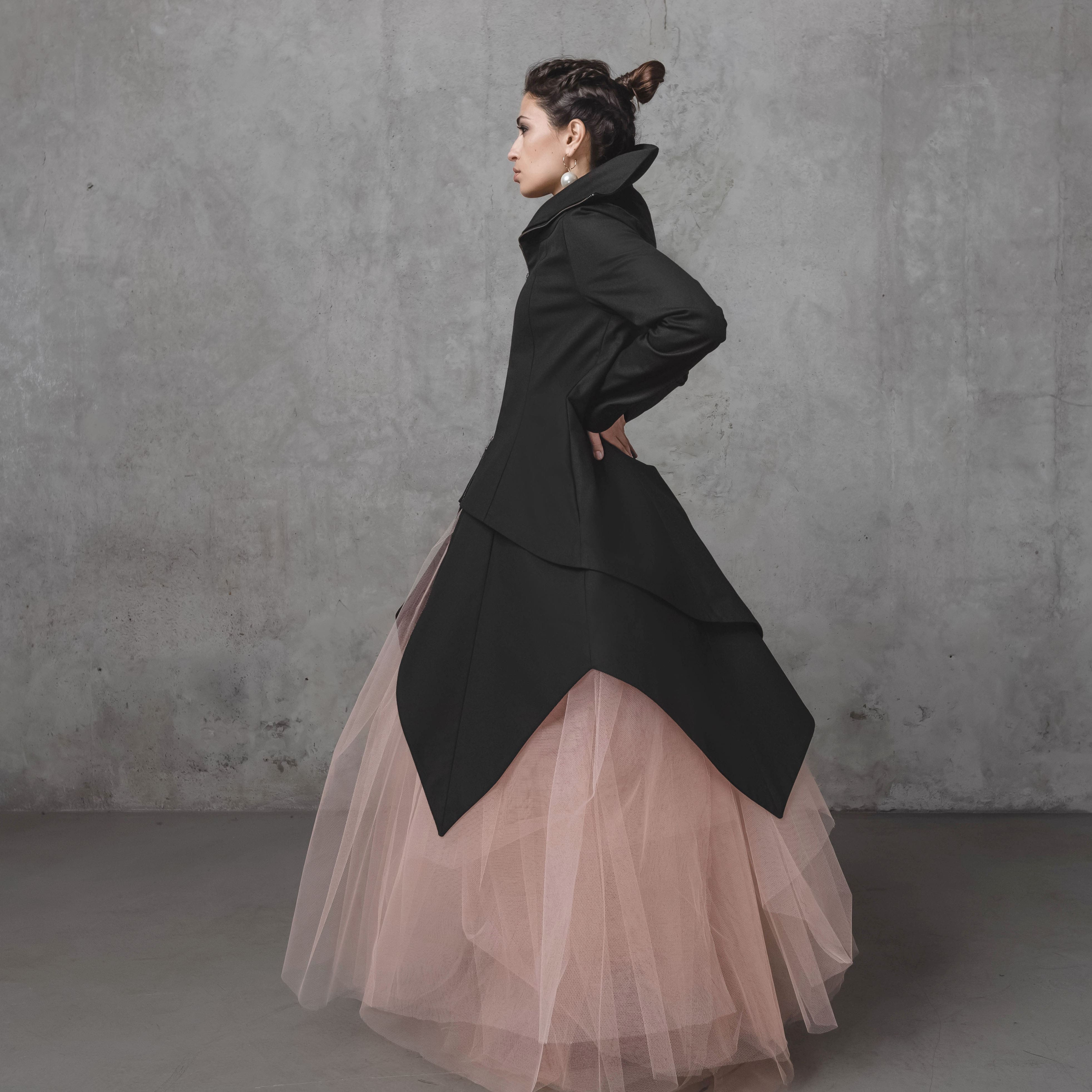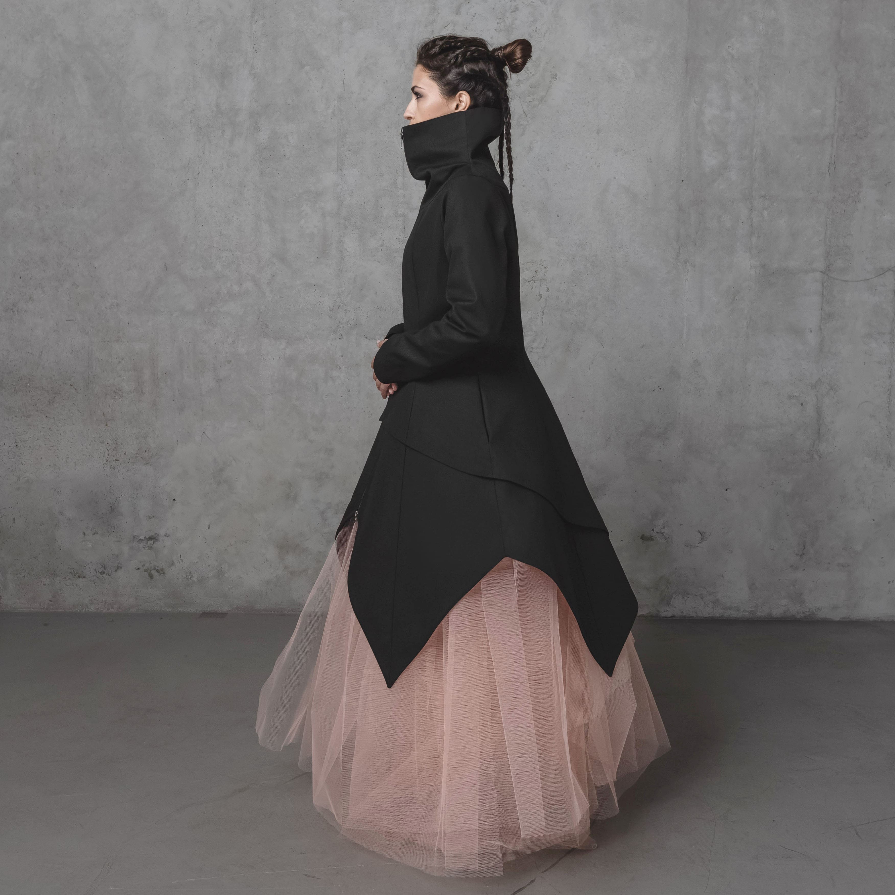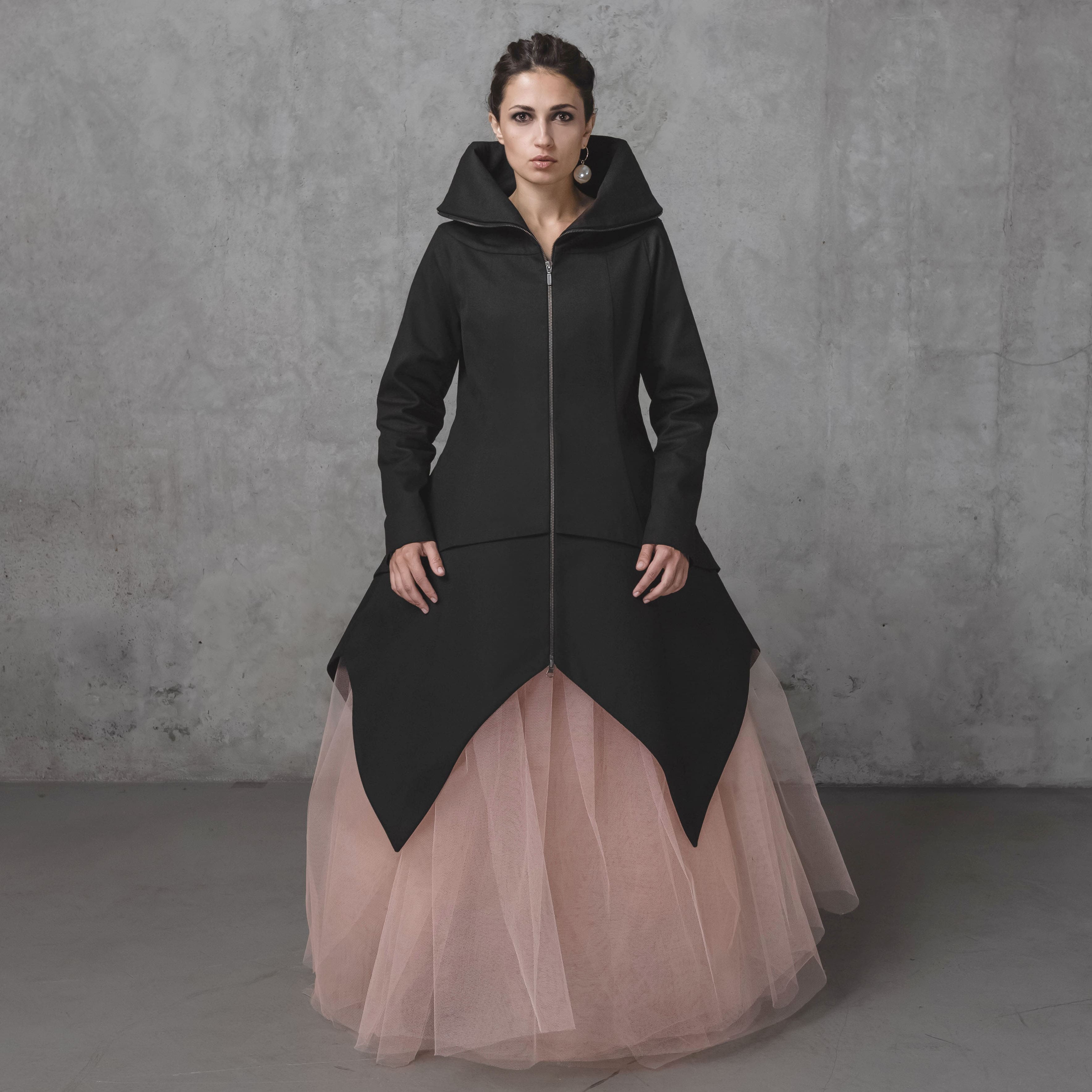 High collar sculptural jacket made in heavy cotton with thin cotton lining.
