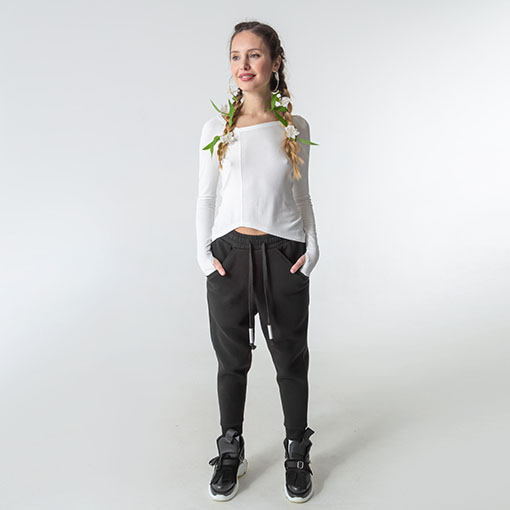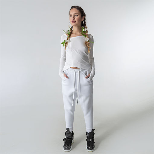 Unisex sweat pants with pockets on the sides & ribbed cuffs. Decorated with massive drawstrings with aluminium caps.