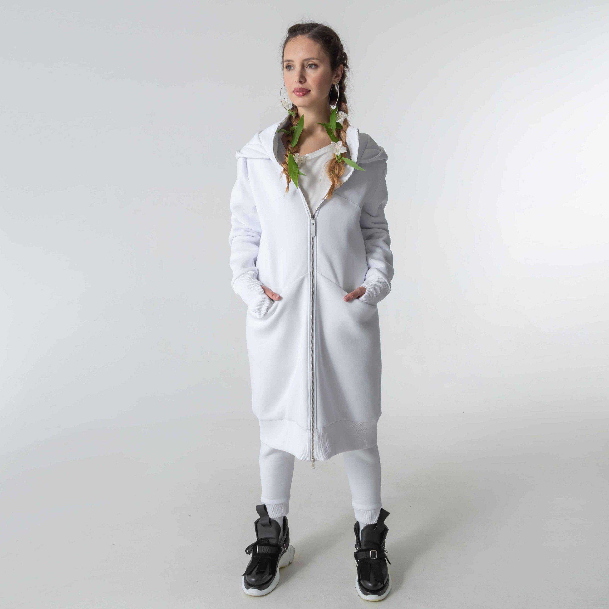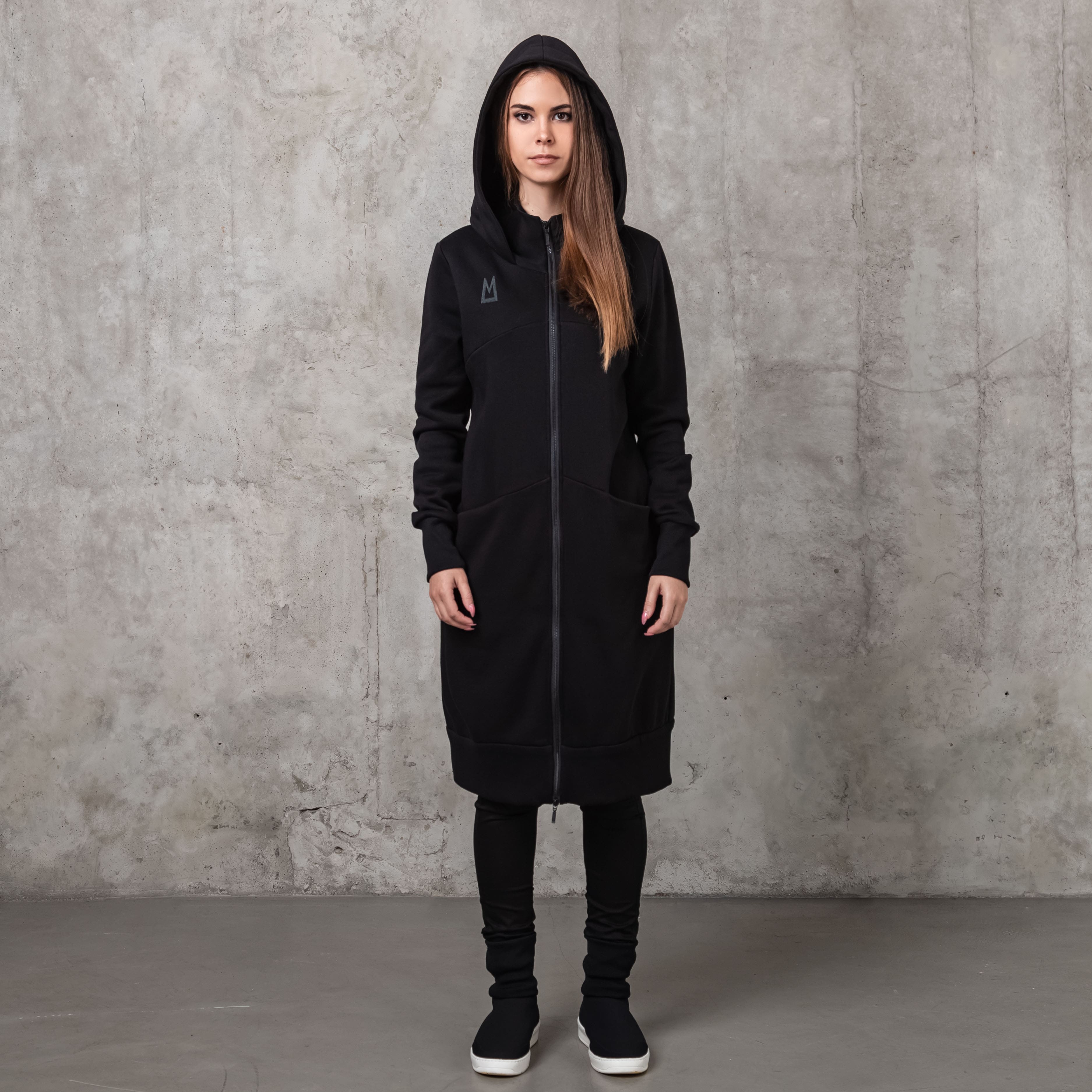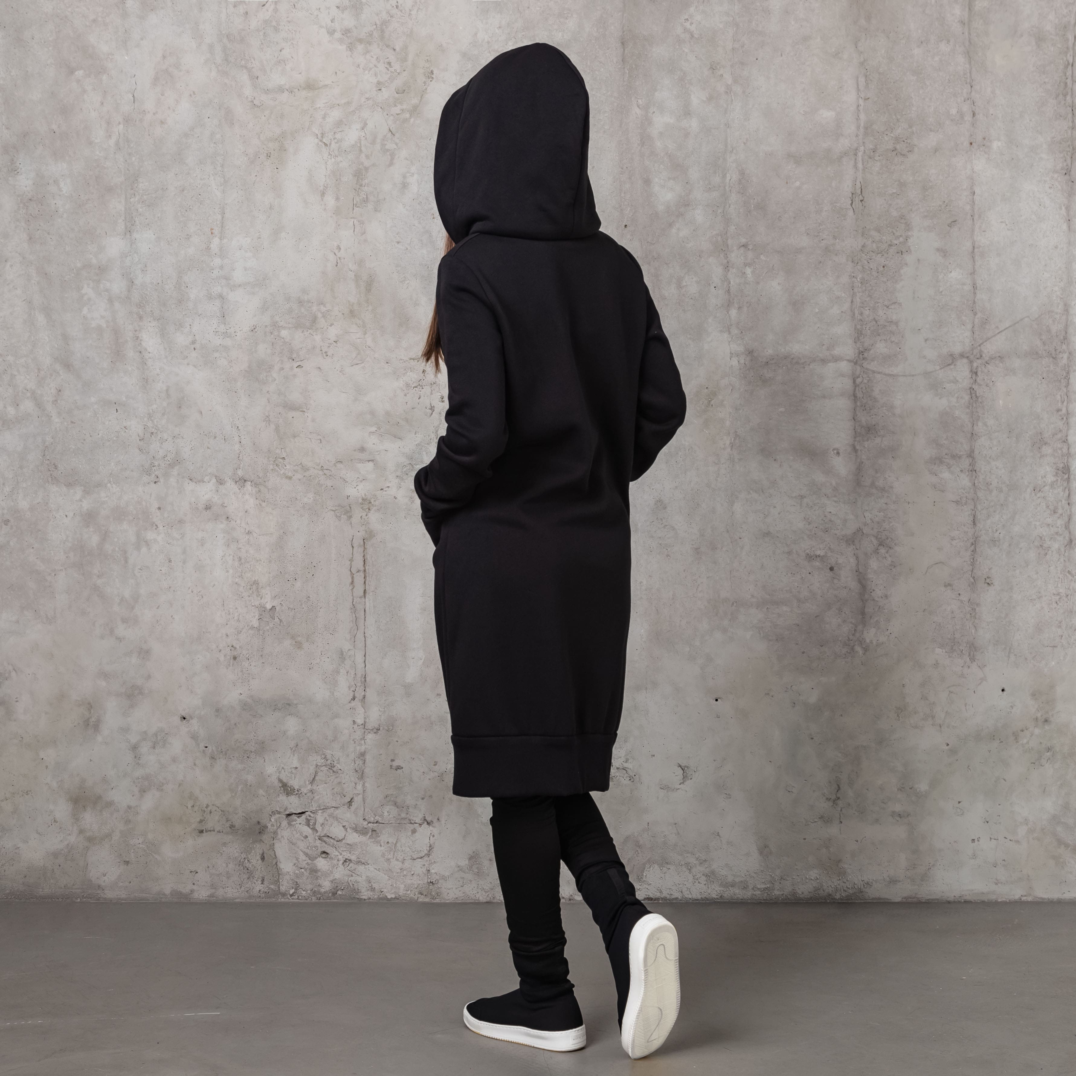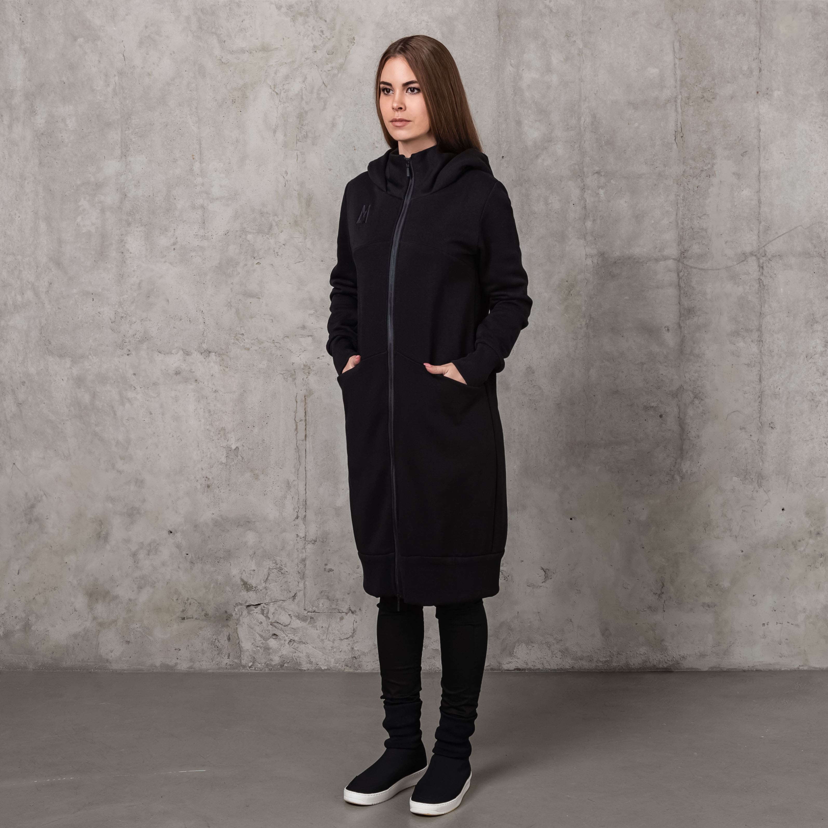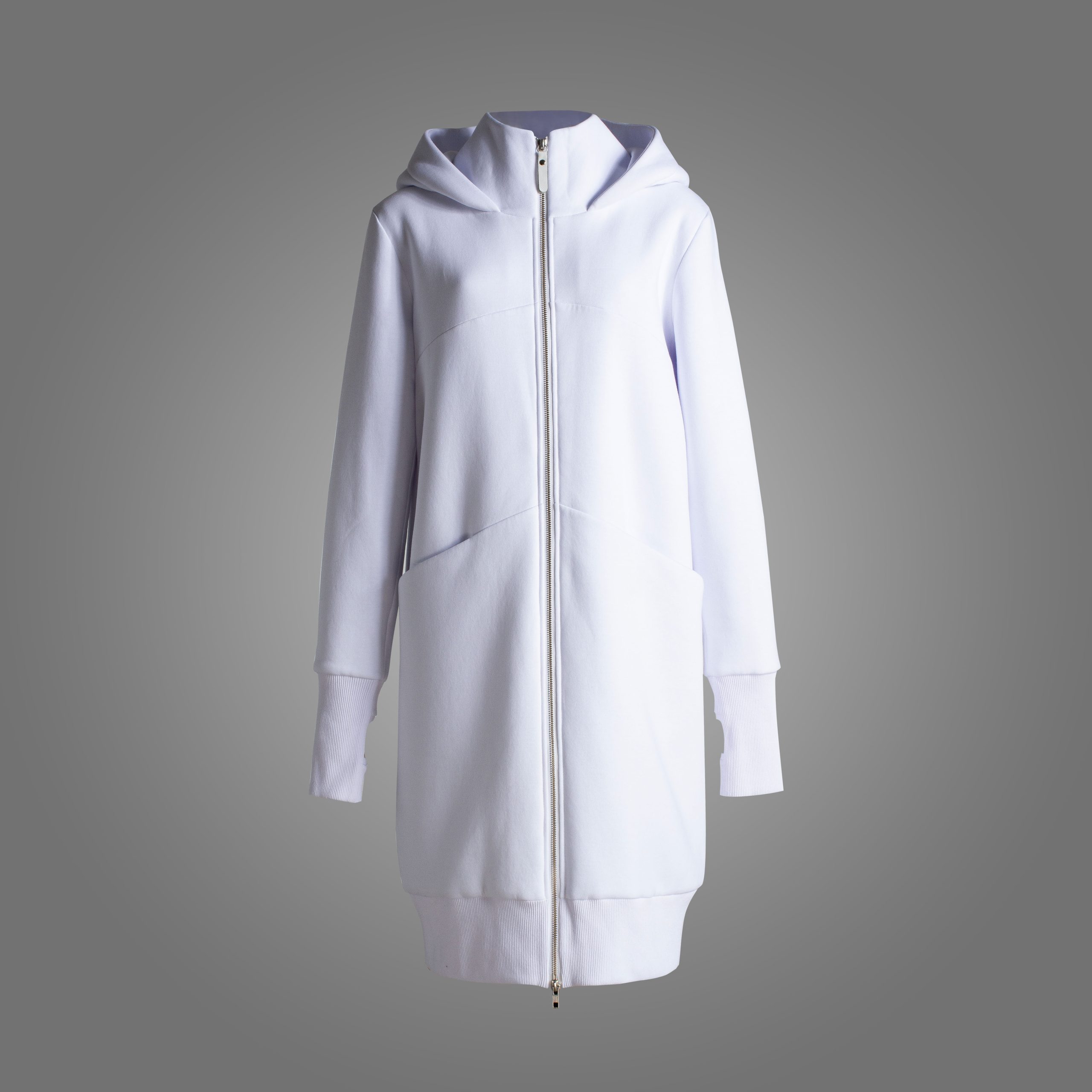 Long architectural hoodie cardigan with a lining and a double-sided zipper. Has pockets in decorative seams on the front. Ribbed on the cuffs and bottom.