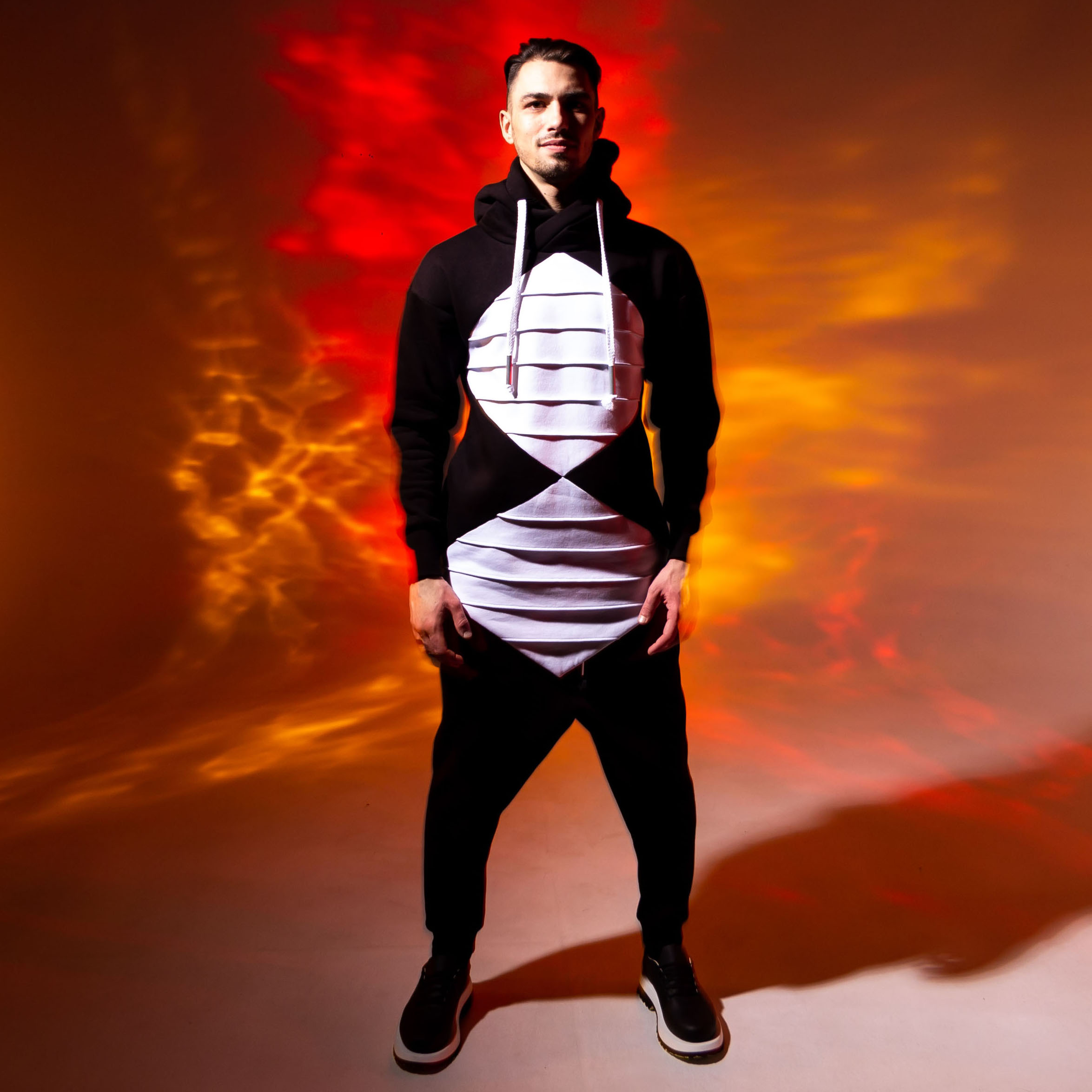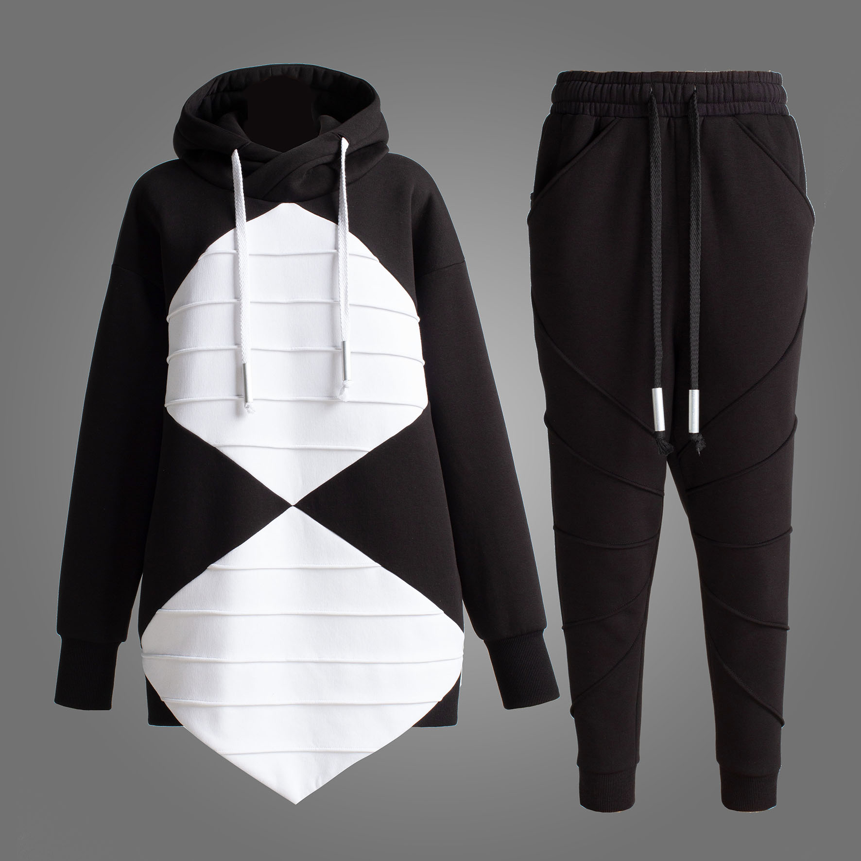 Graphic unisex sweat suit with contrast pleated rhombs on front. Decorated with massive drawstrings with aluminium caps on the hood and the waistline of sweat pants. Has ribbed cuffs & bottom.
