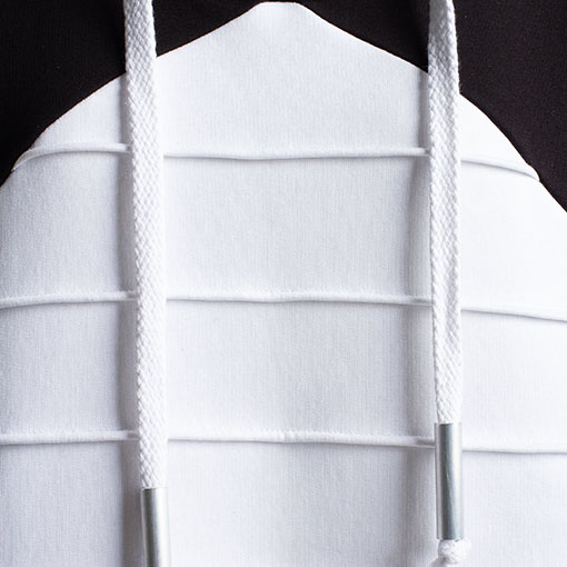Graphic oversize hoodie with contrast pleated rhombs on front. Decorated with massive drawstrings with aluminium caps. Has ribbed cuffs & bottom.