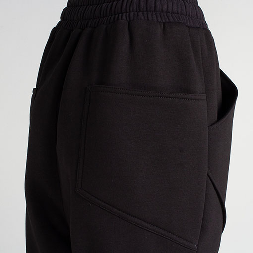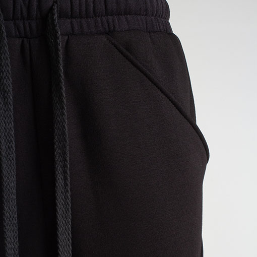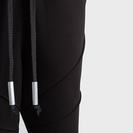 Architectural sweat pants with volumetric seams on front, pockets on sides and ribbed cuffs. Decorated with massive drawstrings with aluminium caps.