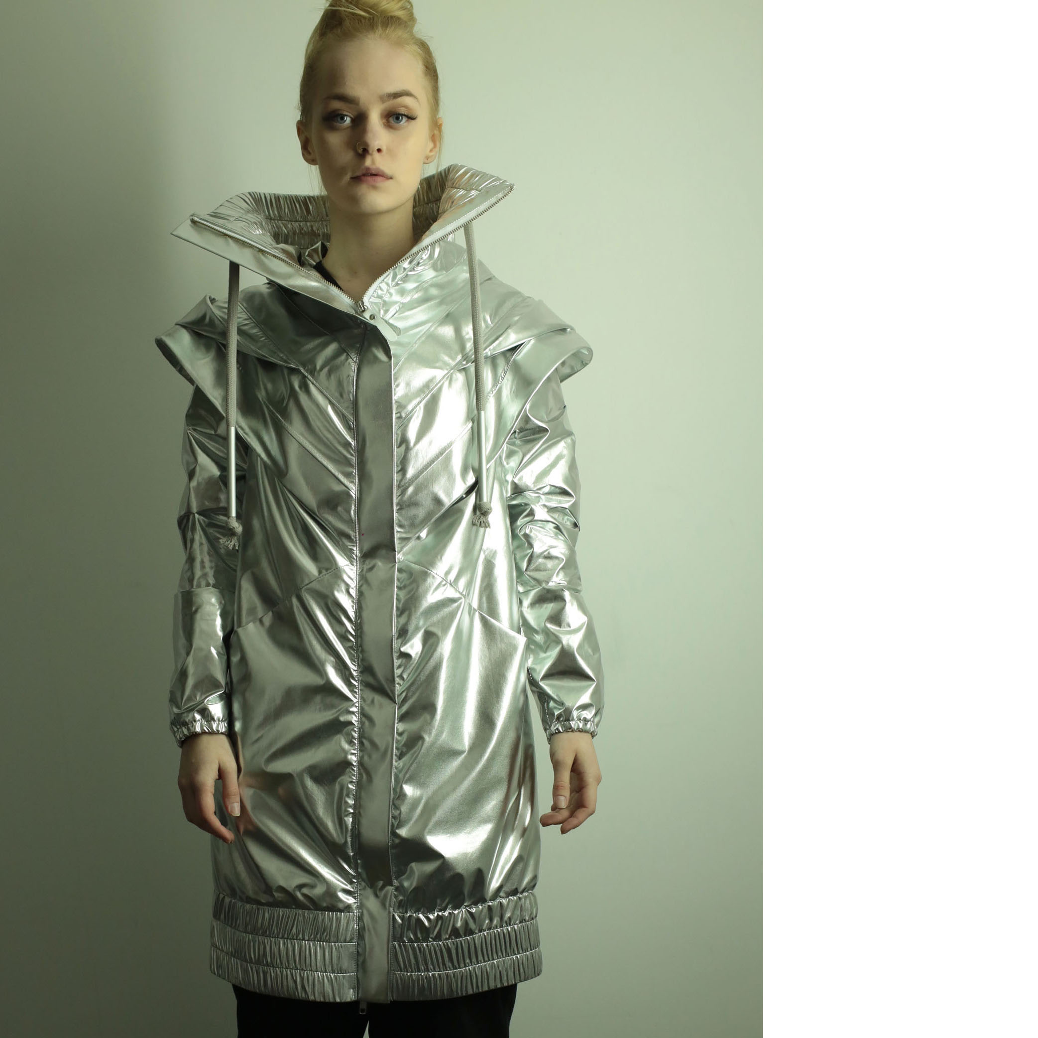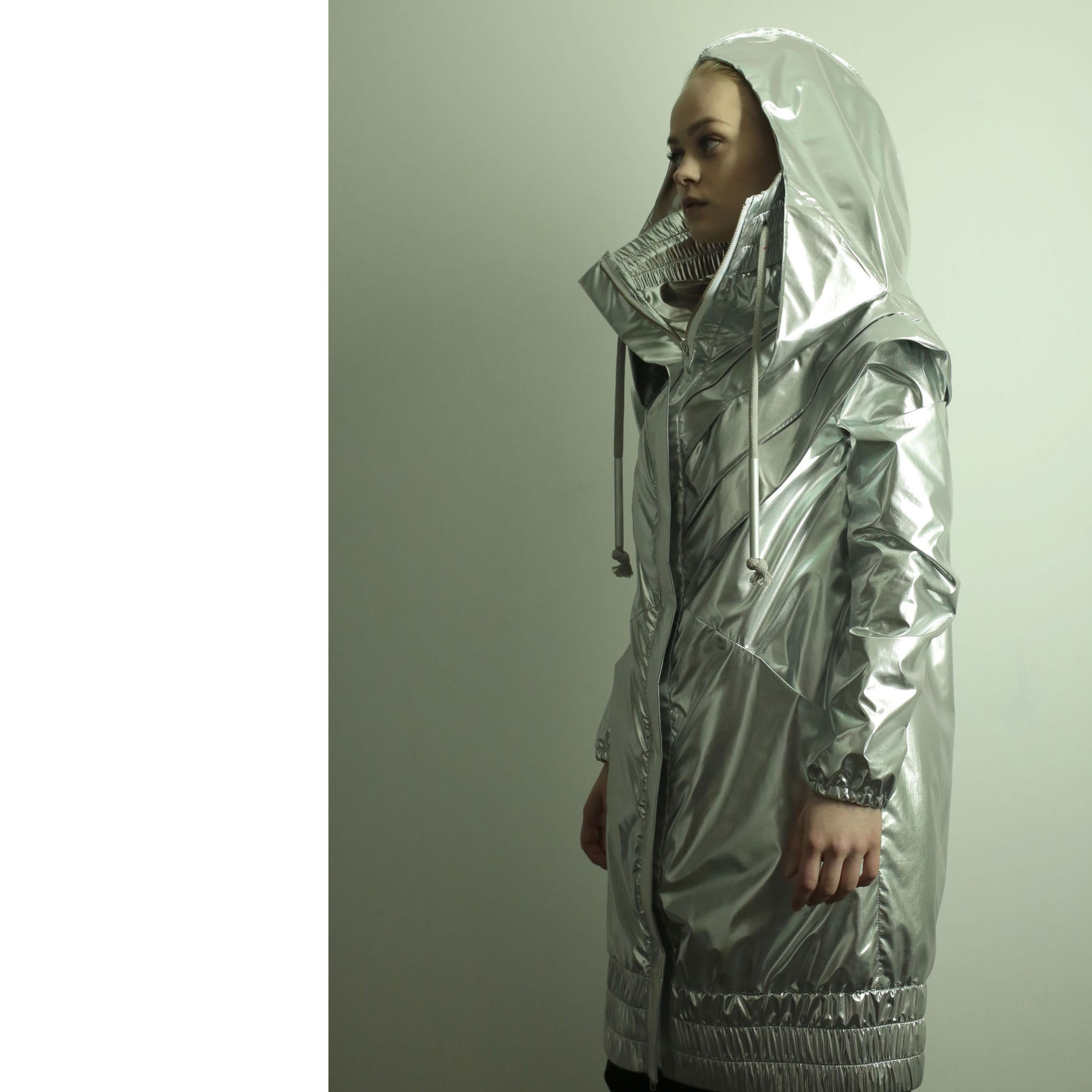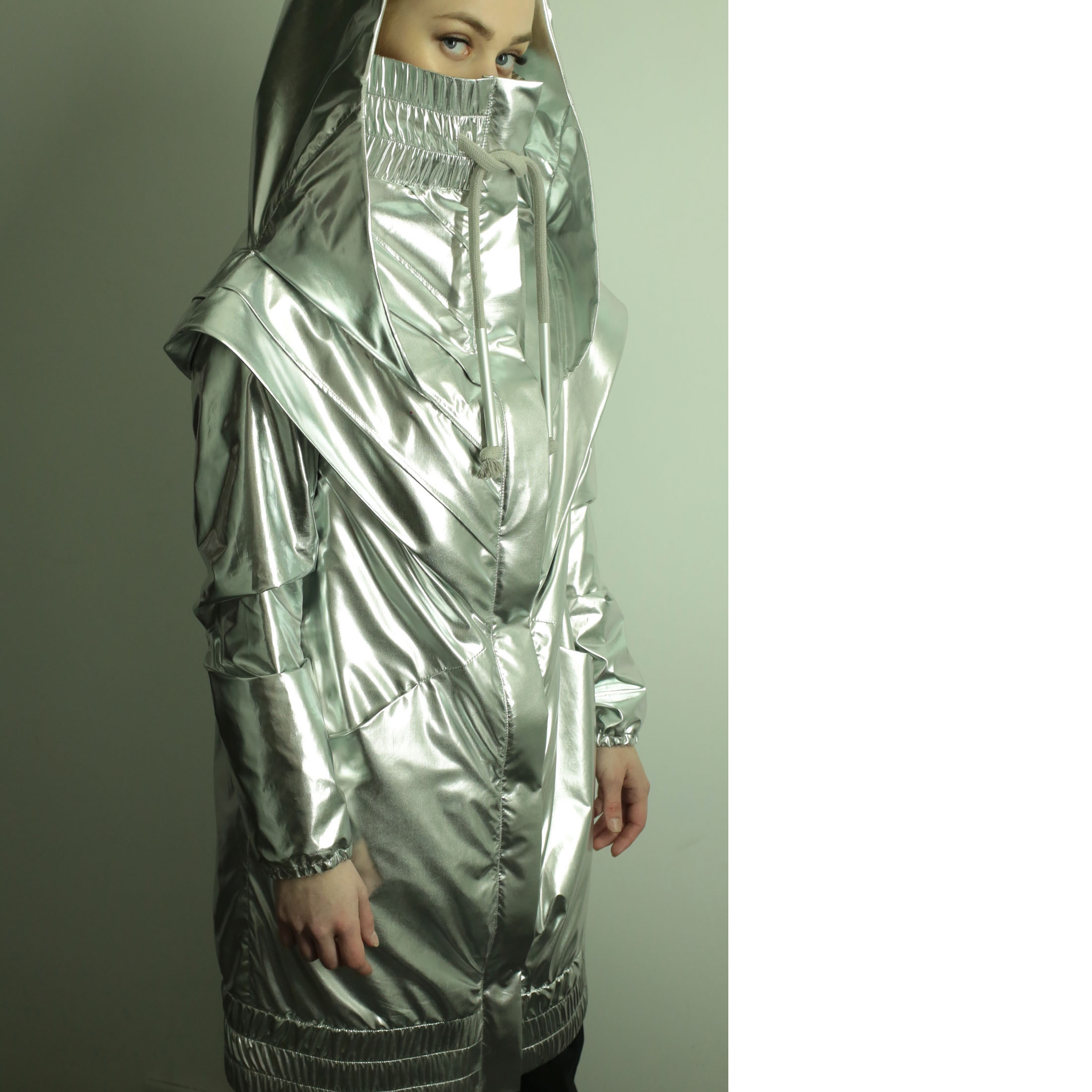 Findings: double-sided metal zipper, drawstrings, aluminum caps