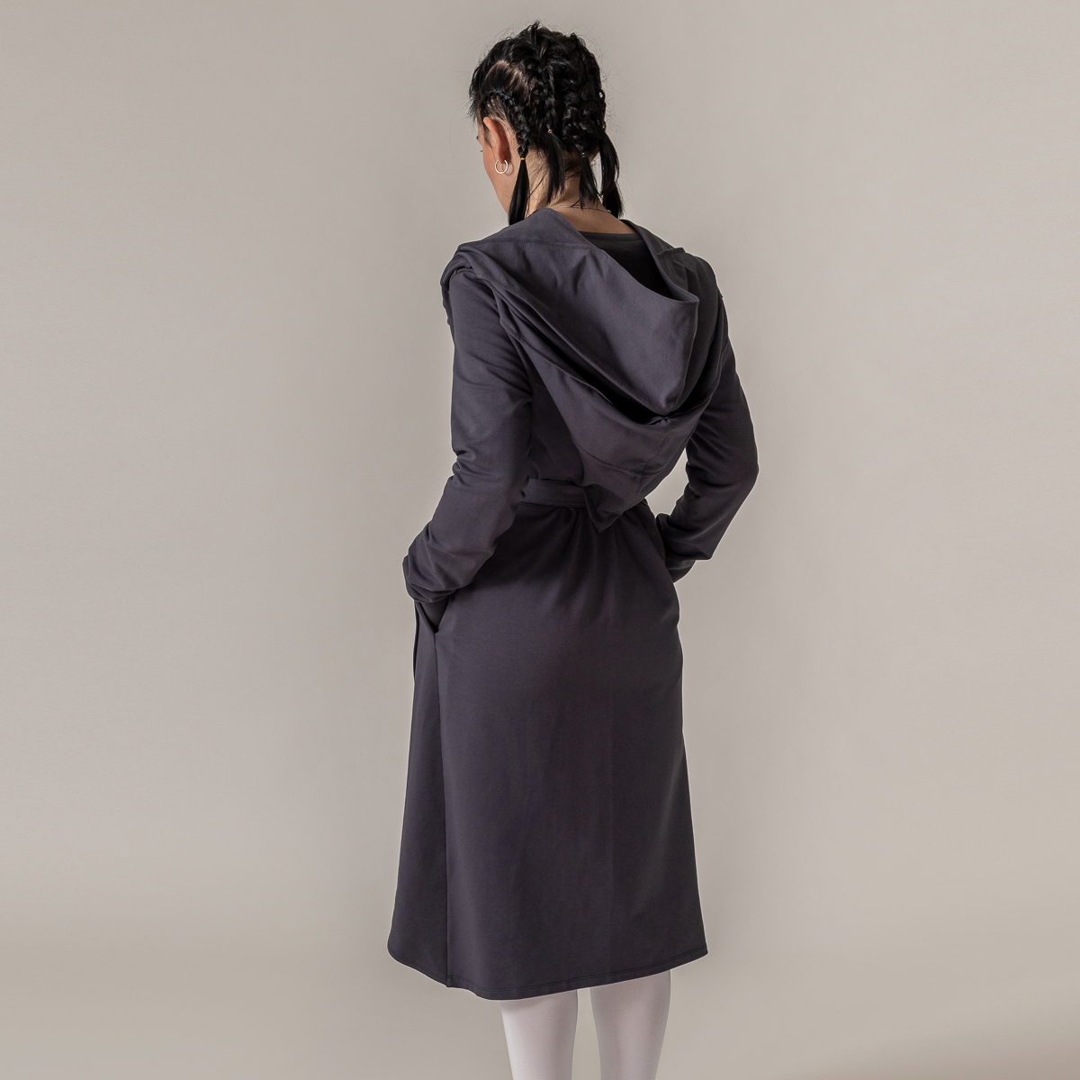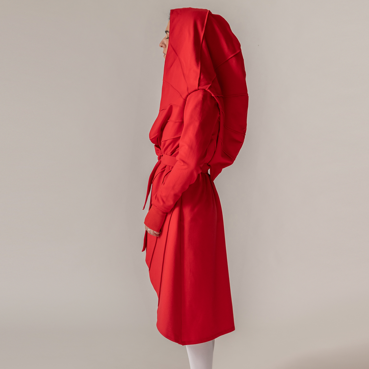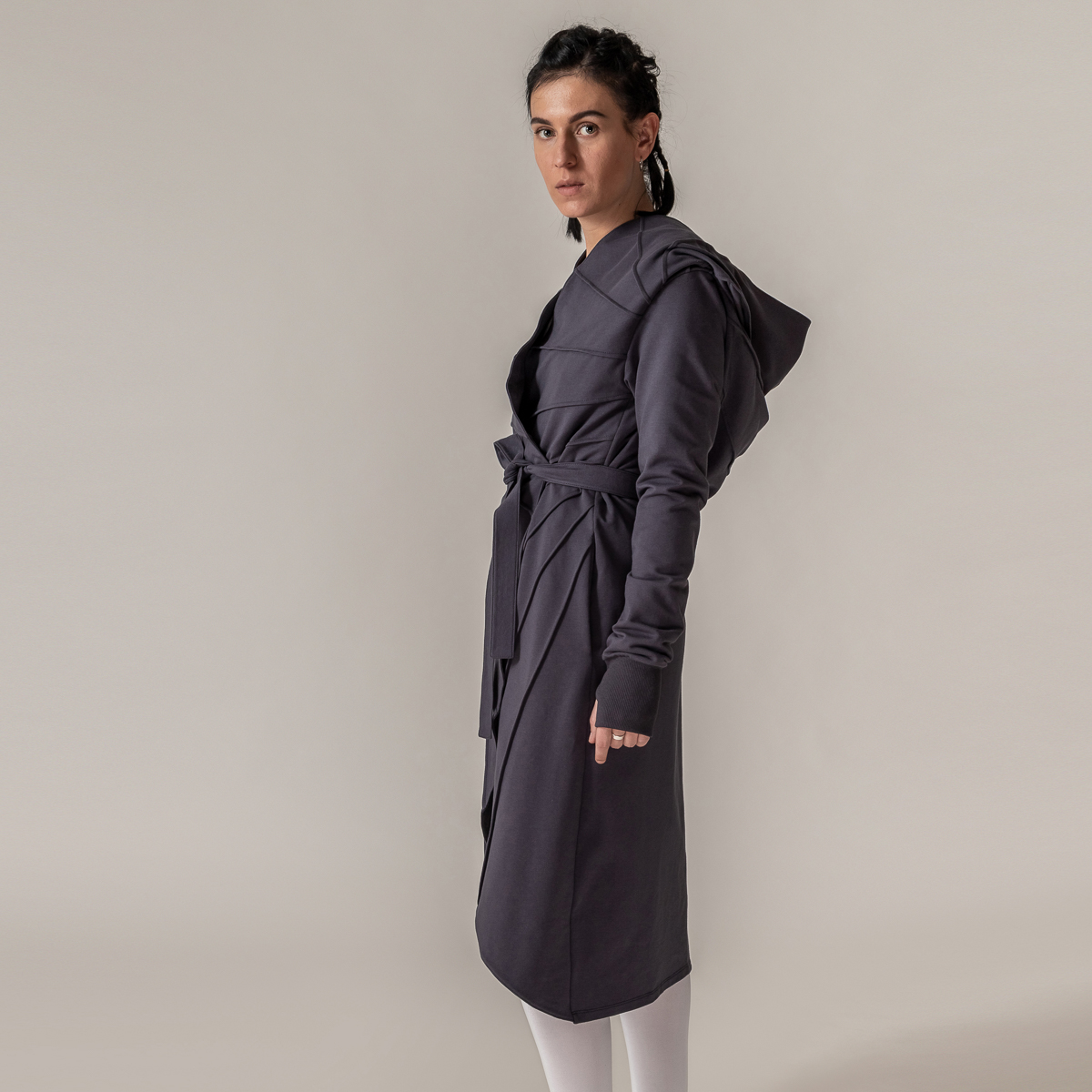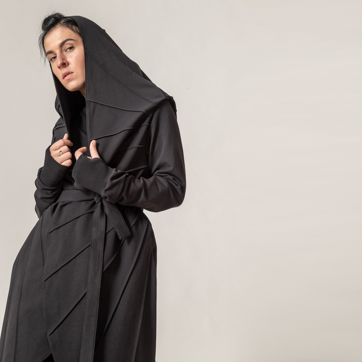 Об’ємний кардиган за концептом дракону з поясом і текстурним капюшоном.