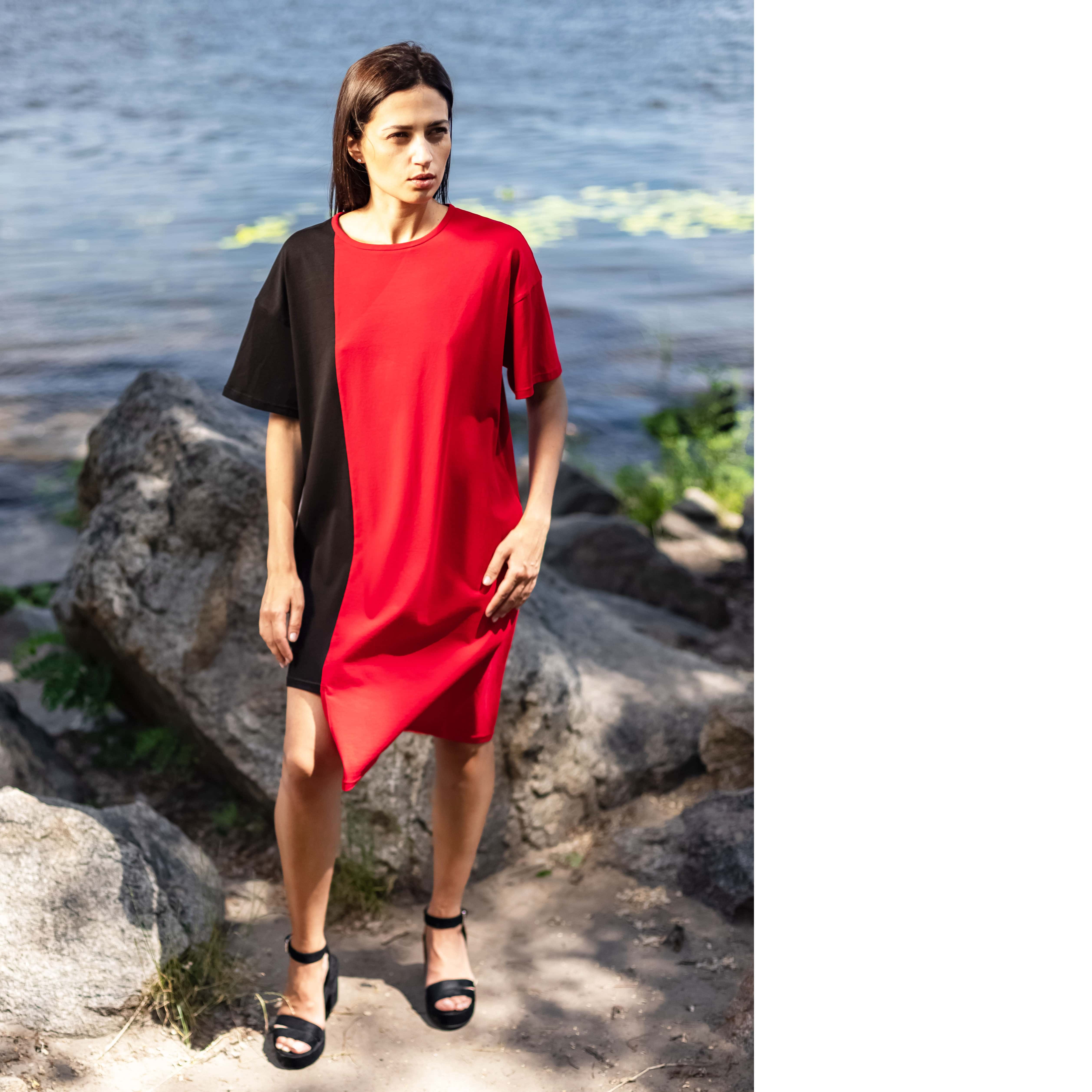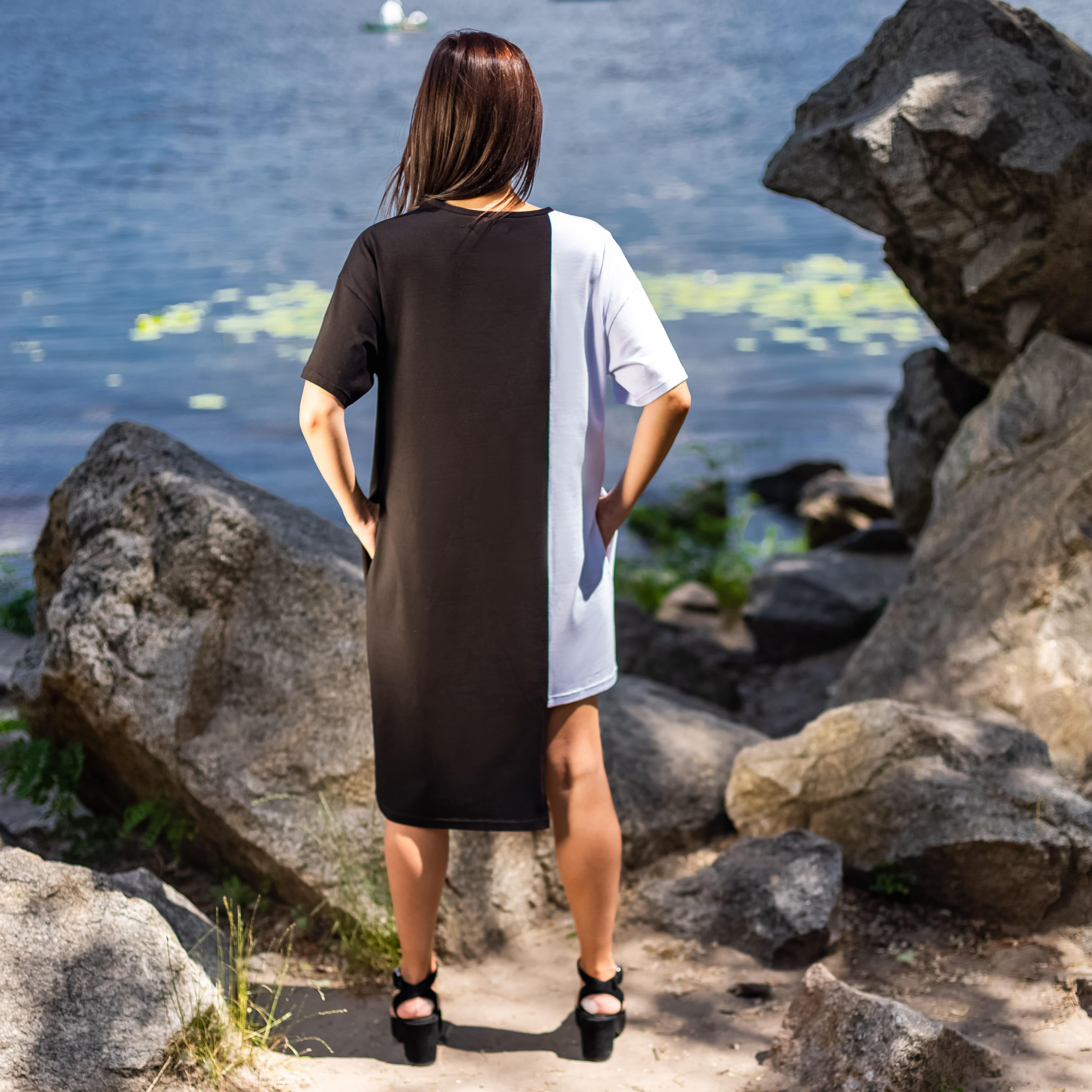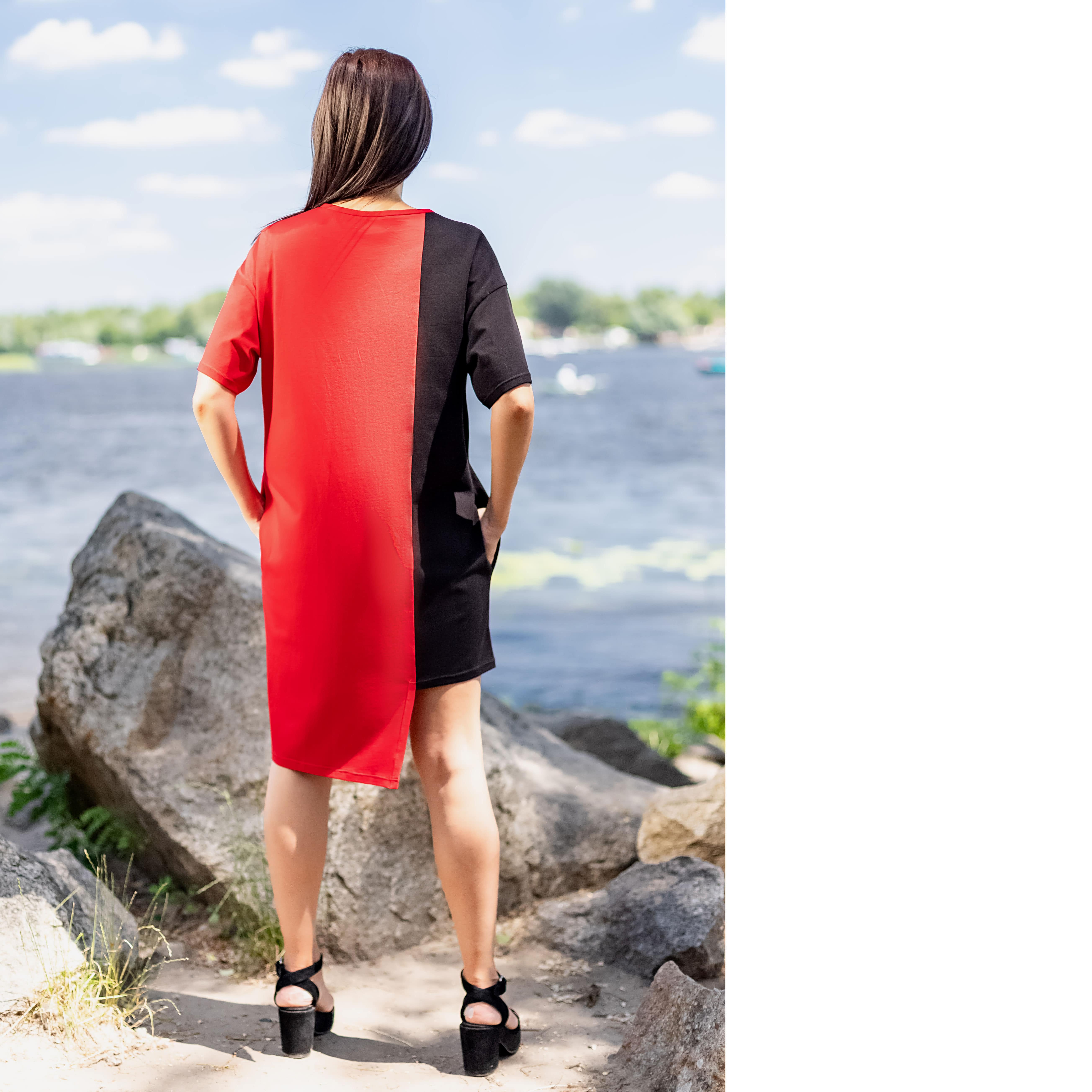 Асиметрична двокольорова сукня з круглою горовиною та карманами.
