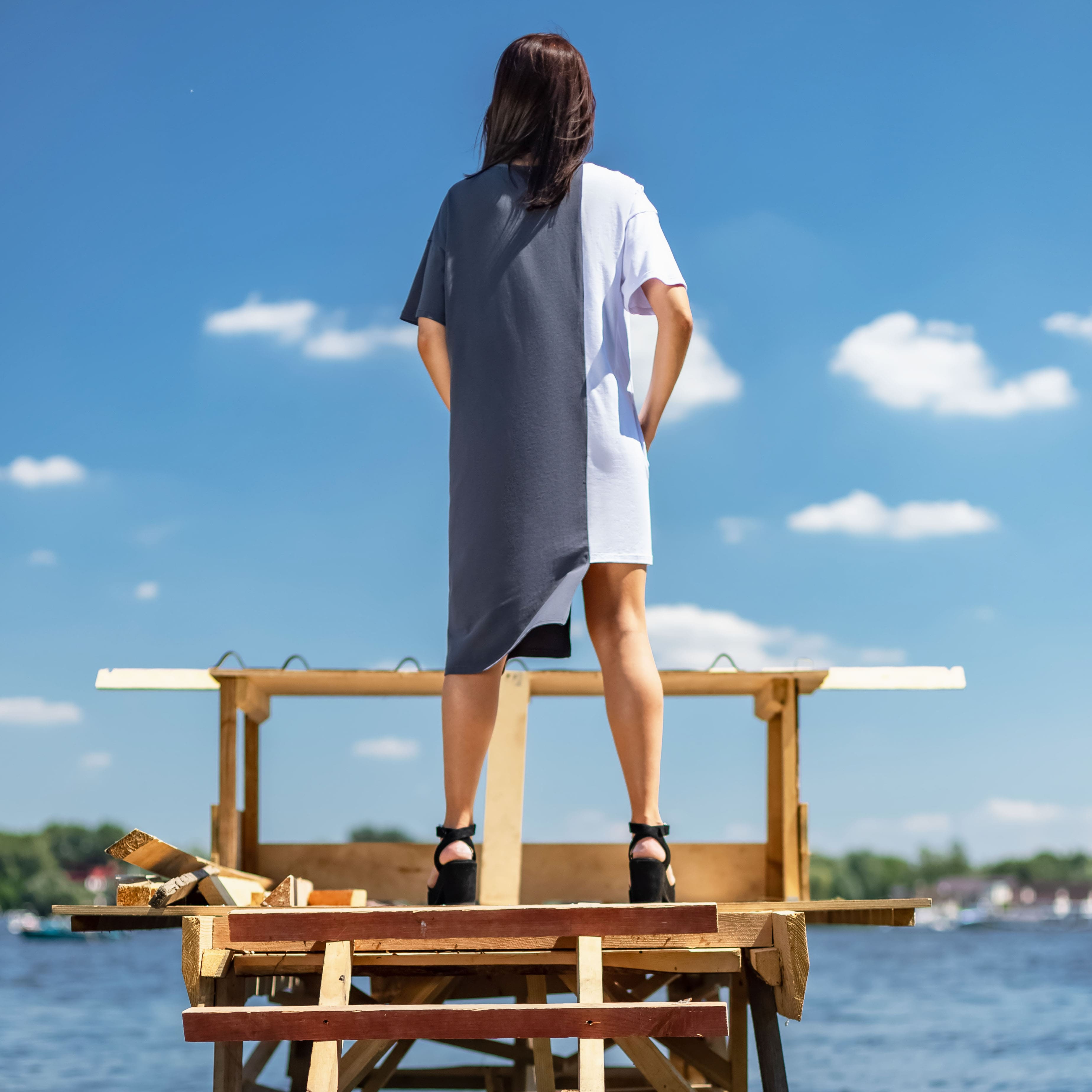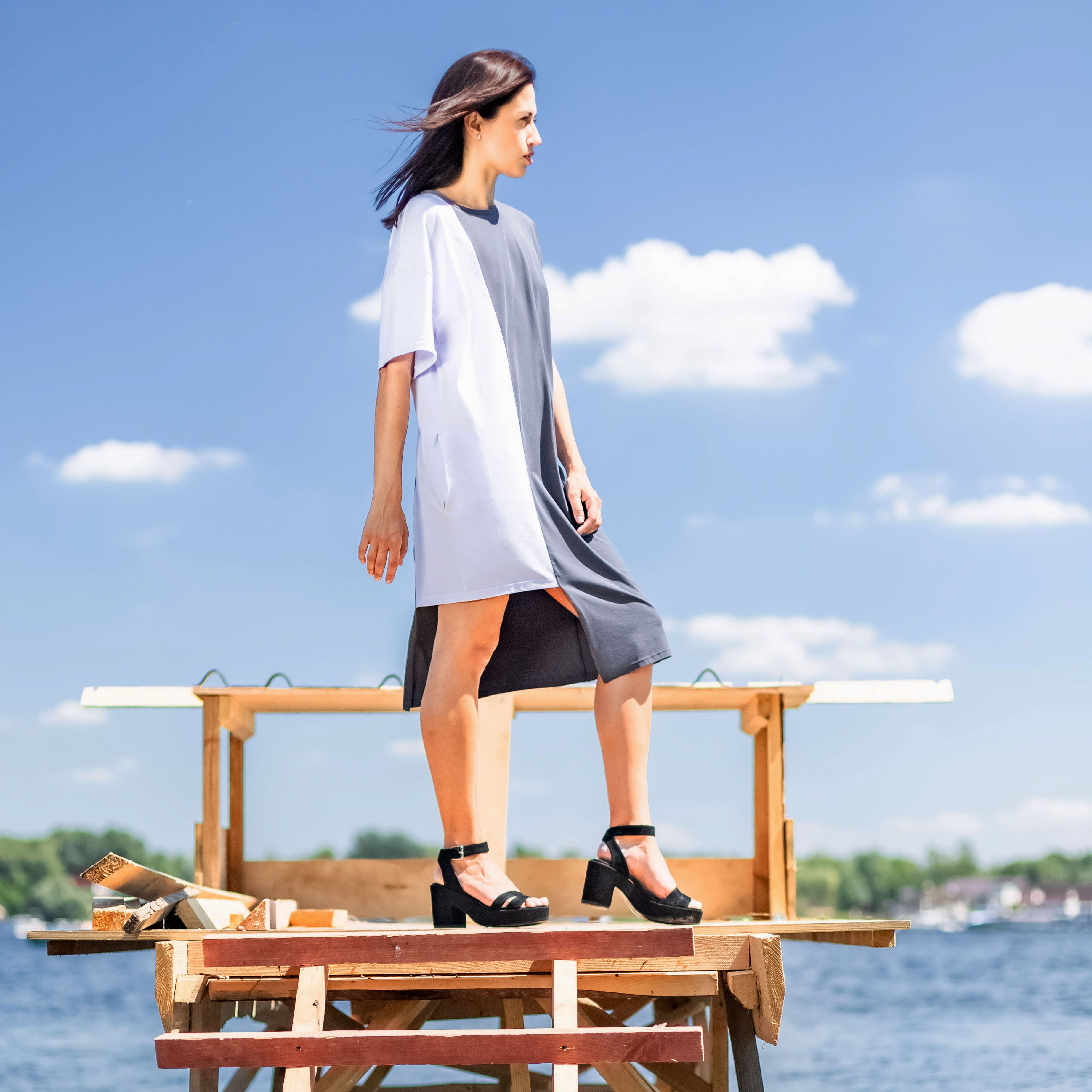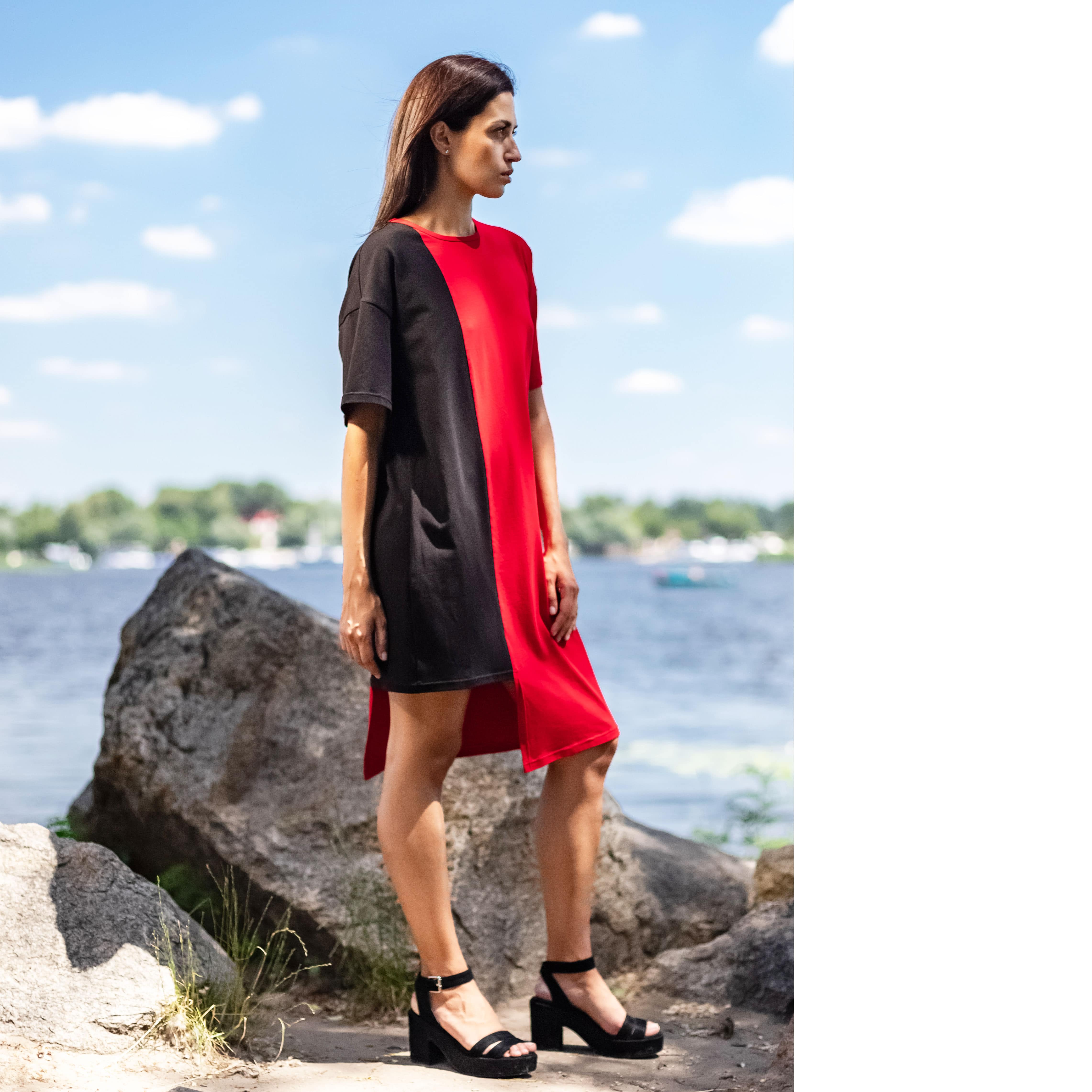 Асиметрична двокольорова сукня з круглою горовиною та карманами.