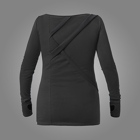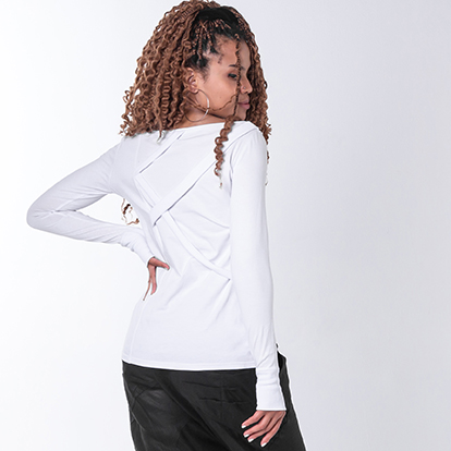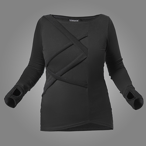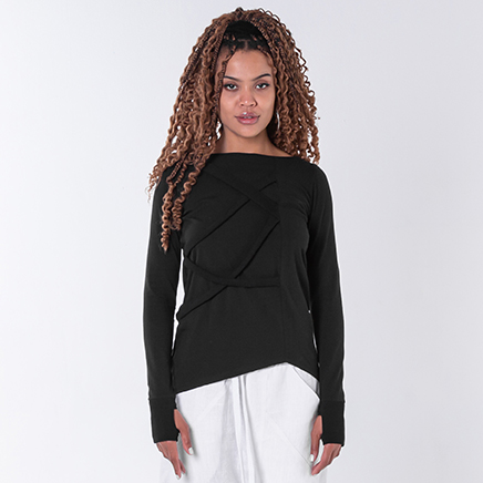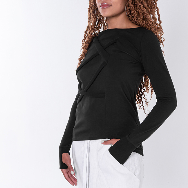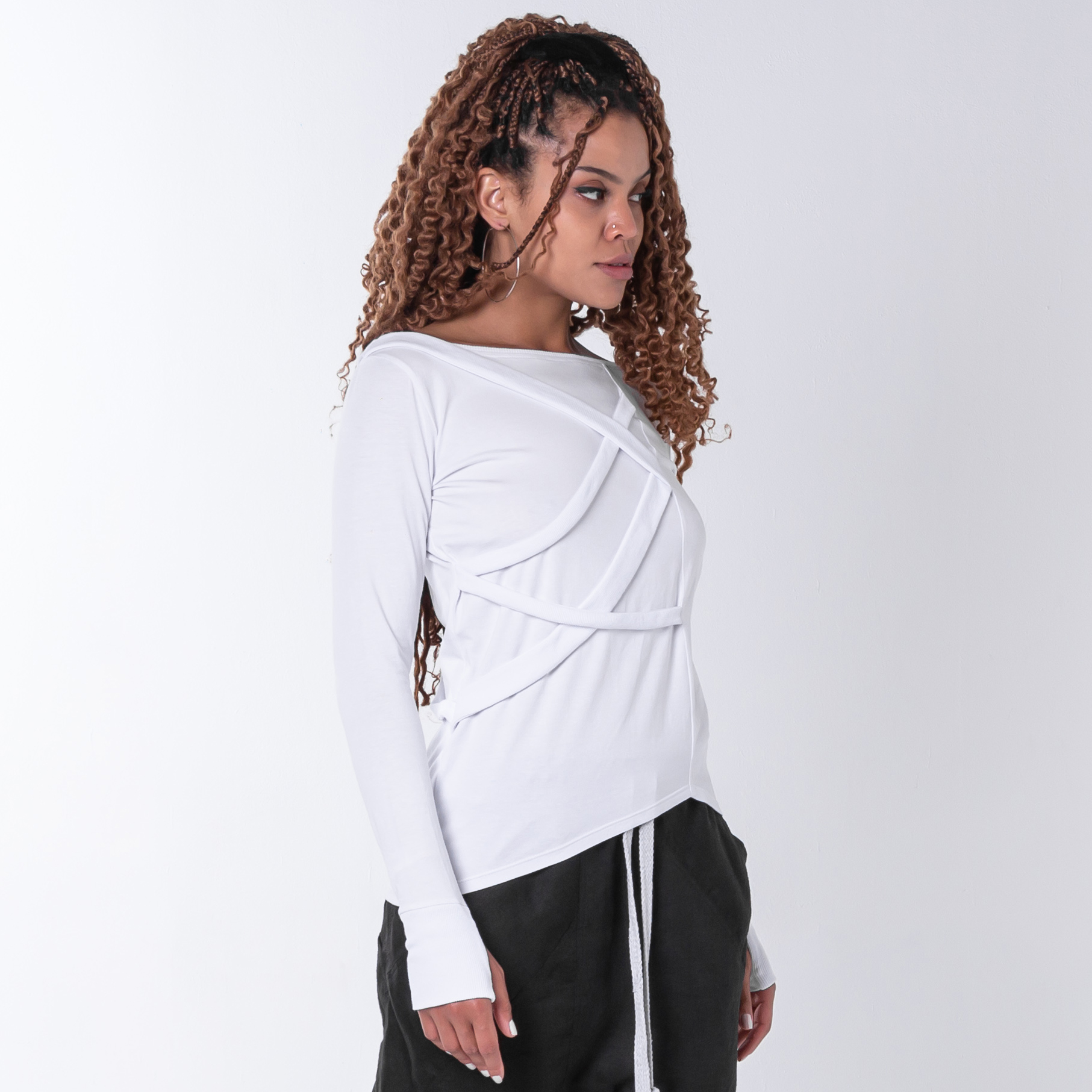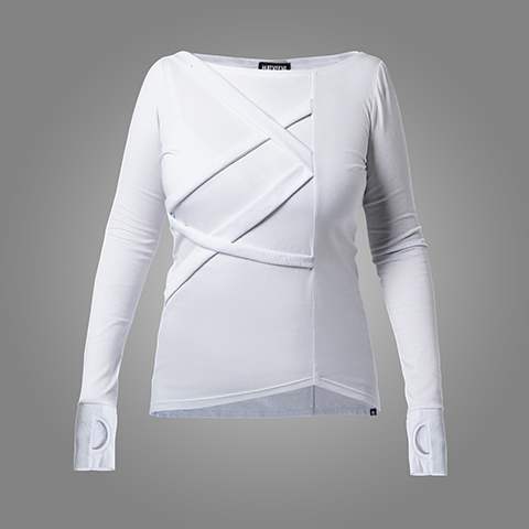 Асиметричний лонгслів, декорований полосками. Має зручні отвори для великого пальця на манжетах. Матеріал: 98% бавовна 2% еластан.