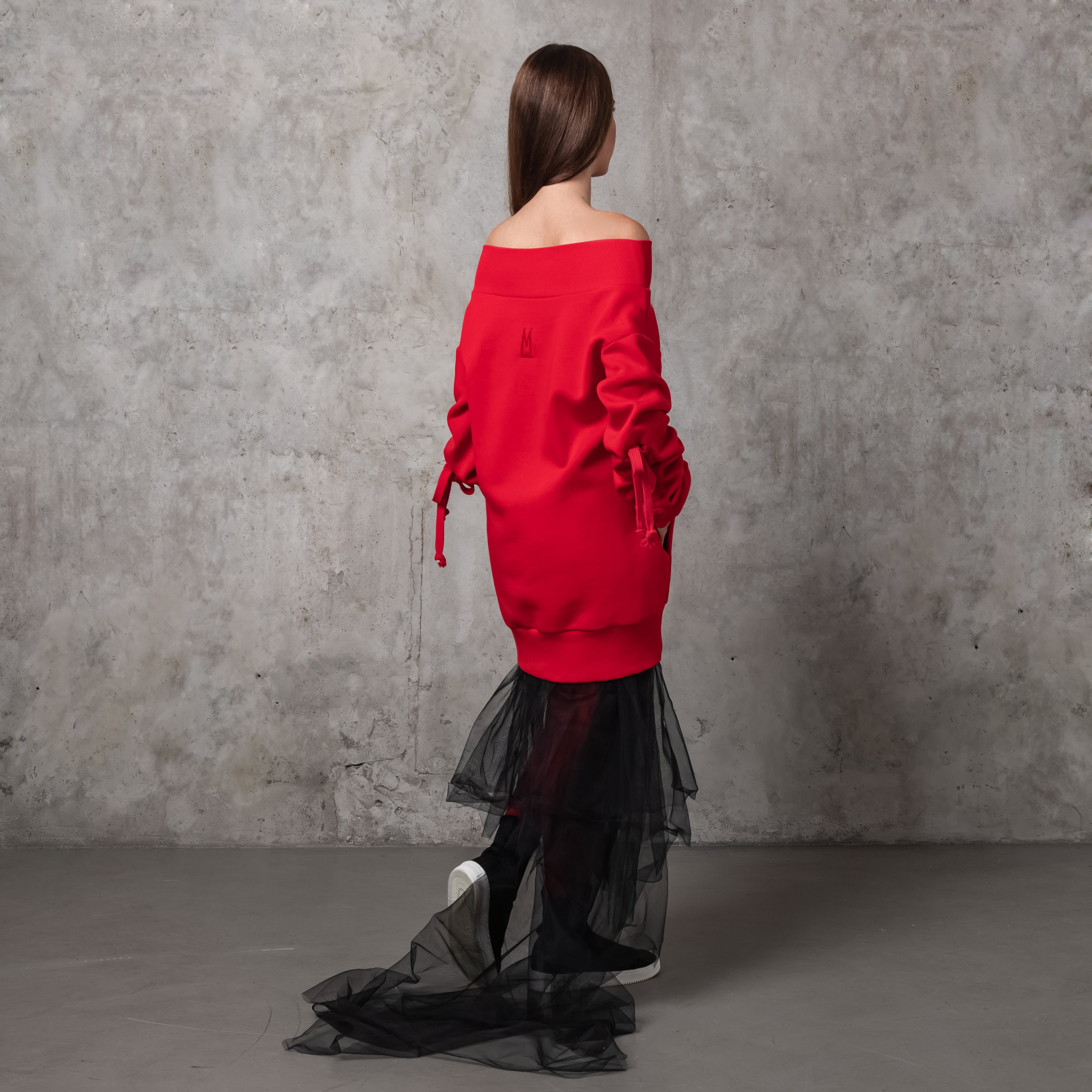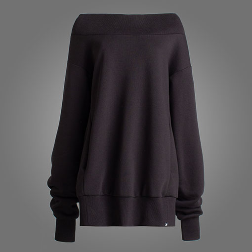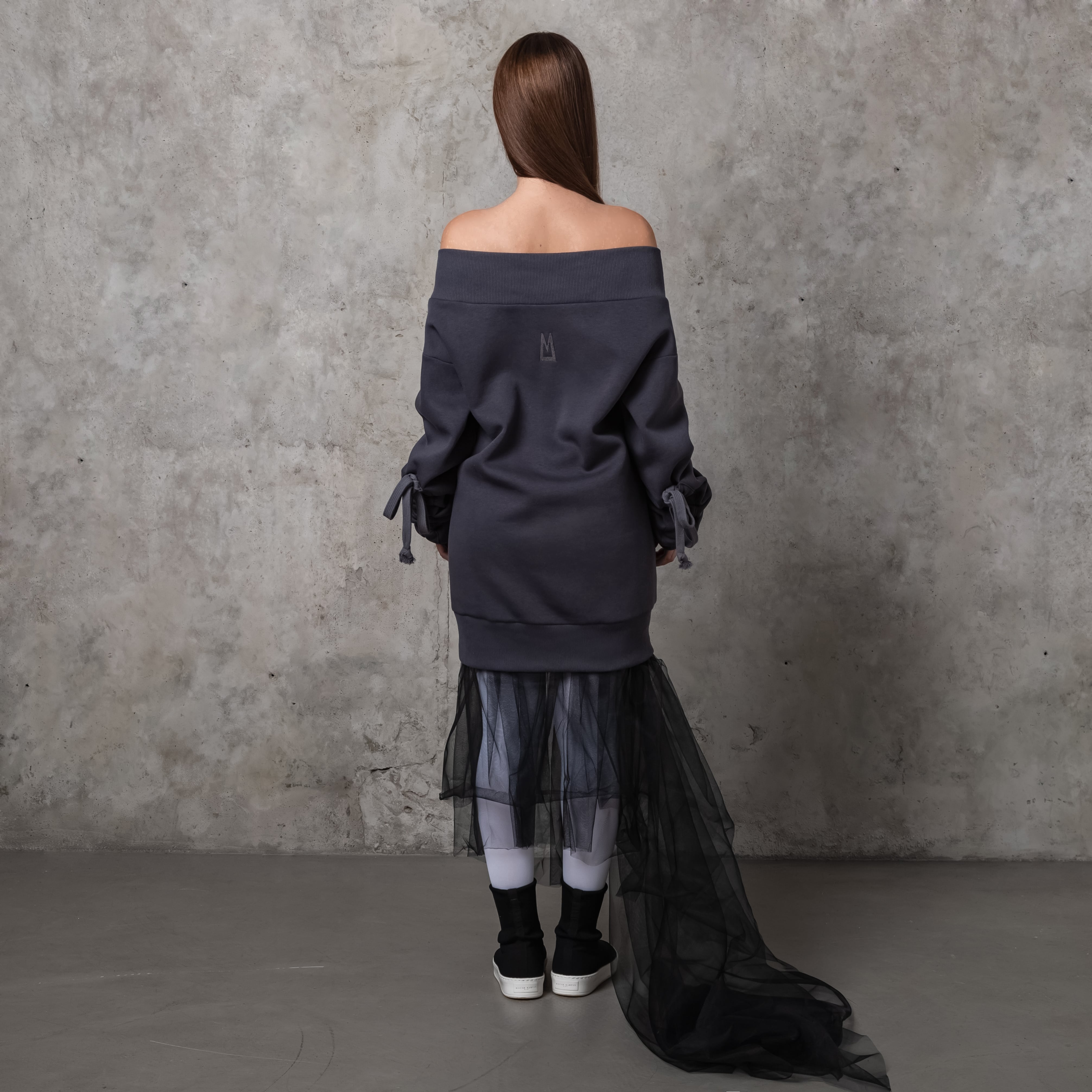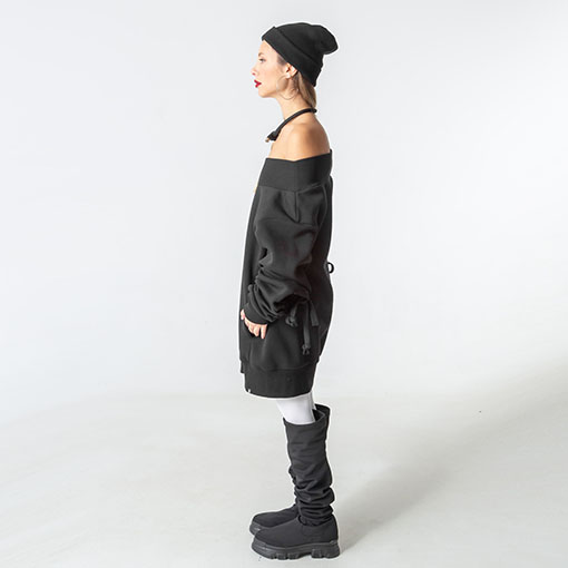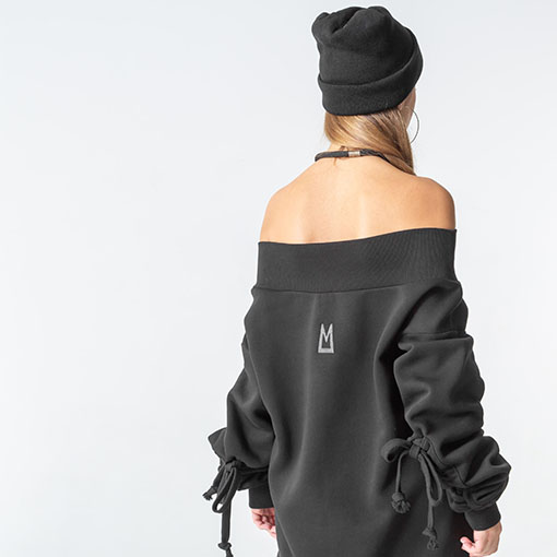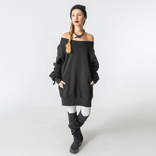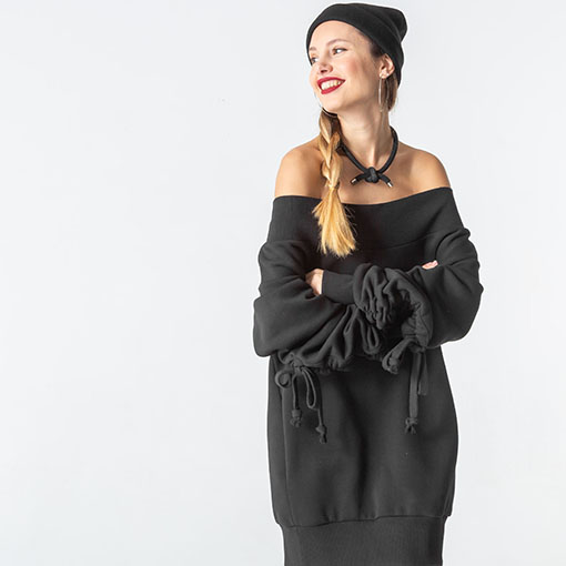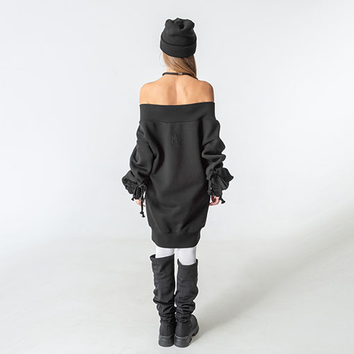 Тепла оверсайз сукня-светр зі спадаючими плечима та об’ємними рукавами. Оздоблена брендовою вишивкою позаду. Має верх, низ та манжети на резинці.