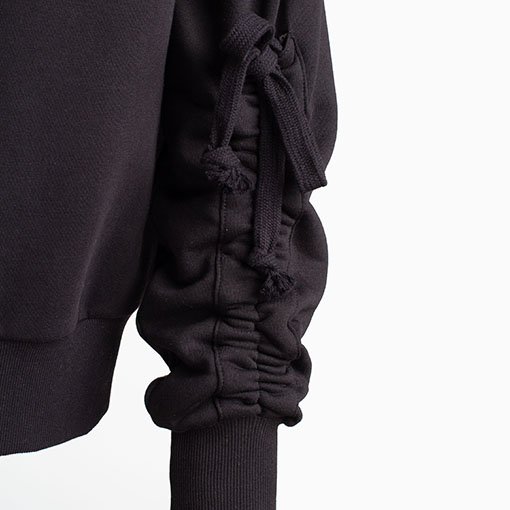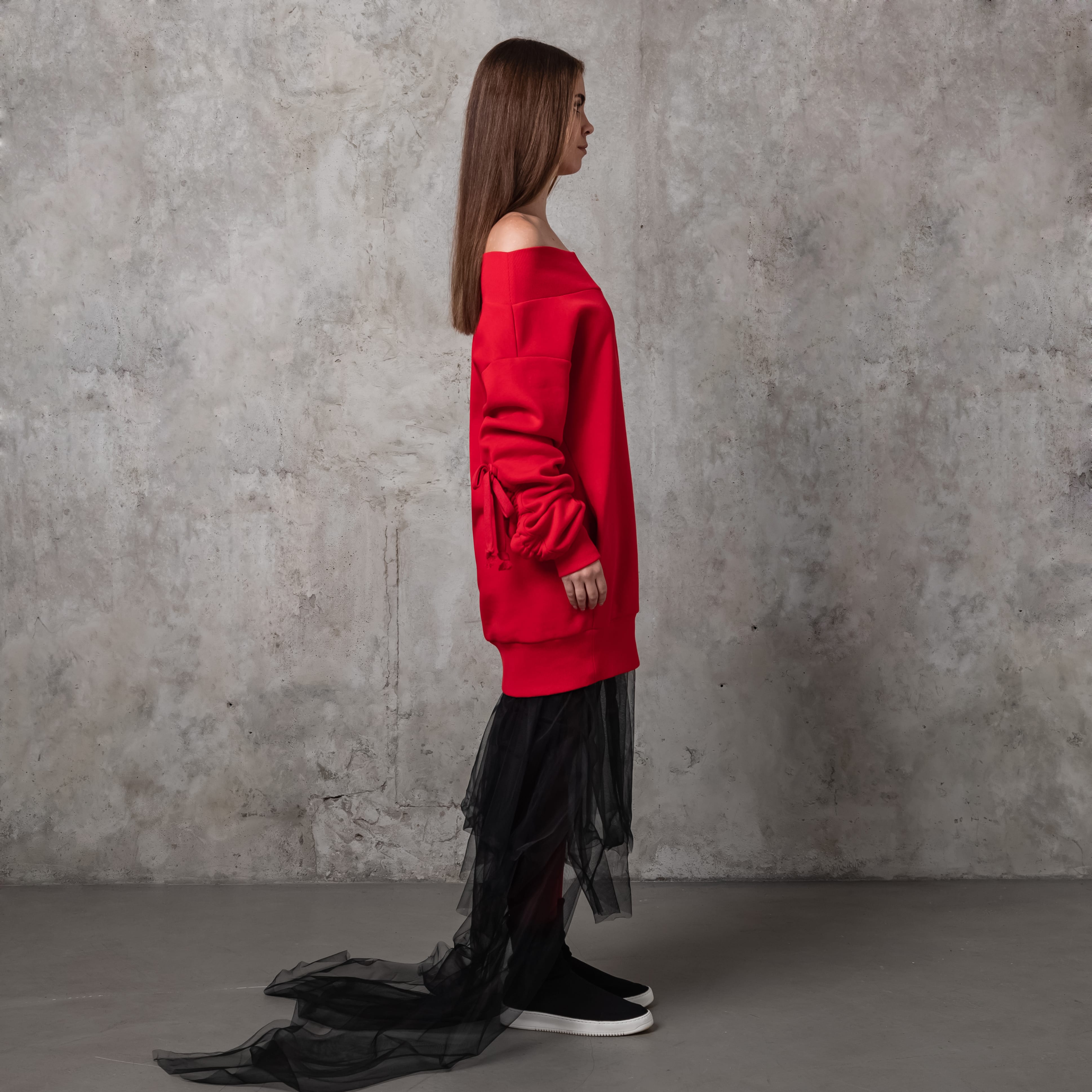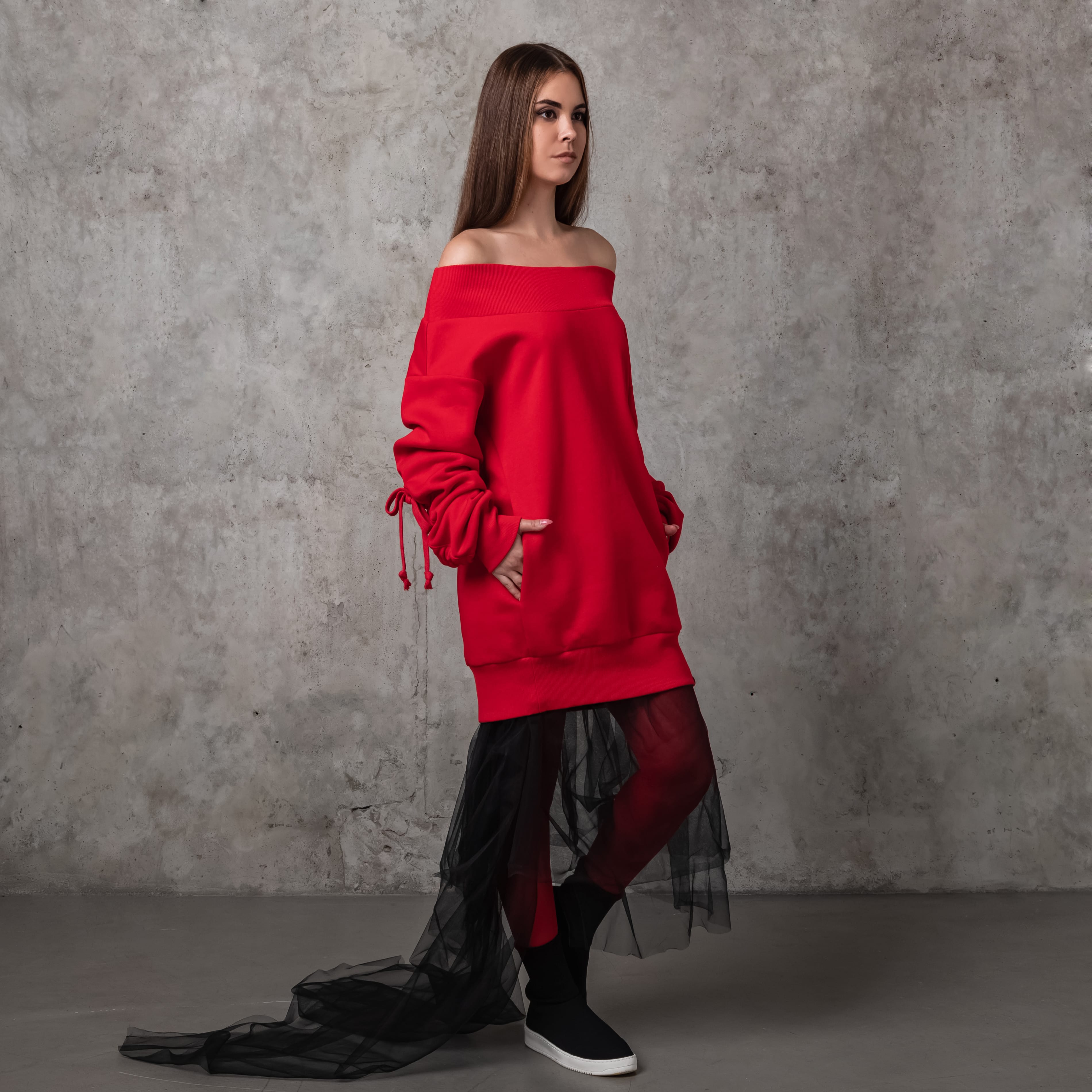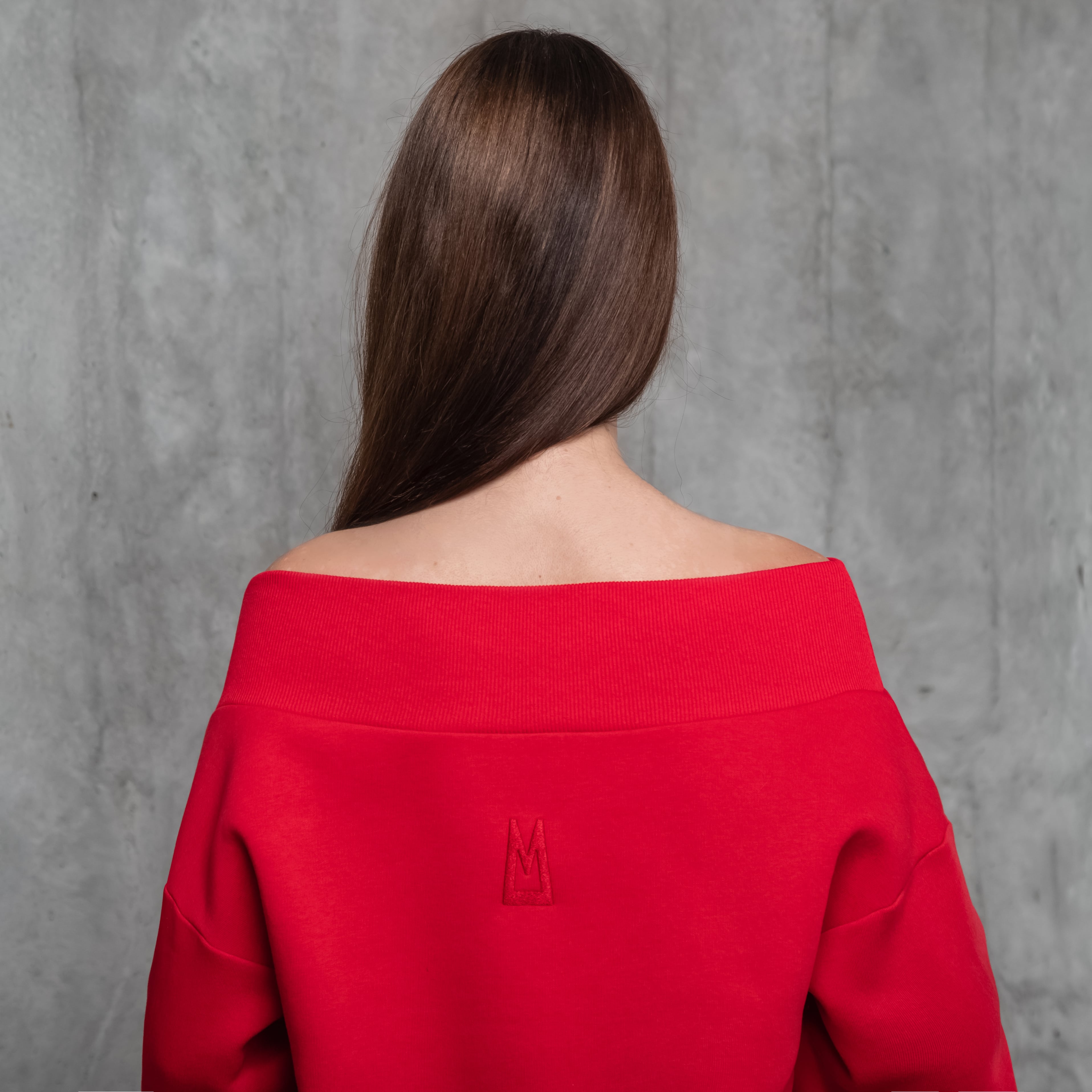 Тепла оверсайз сукня-светр зі спадаючими плечима та об’ємними рукавами. Оздоблена брендовою вишивкою позаду. Має верх, низ та манжети на резинці.