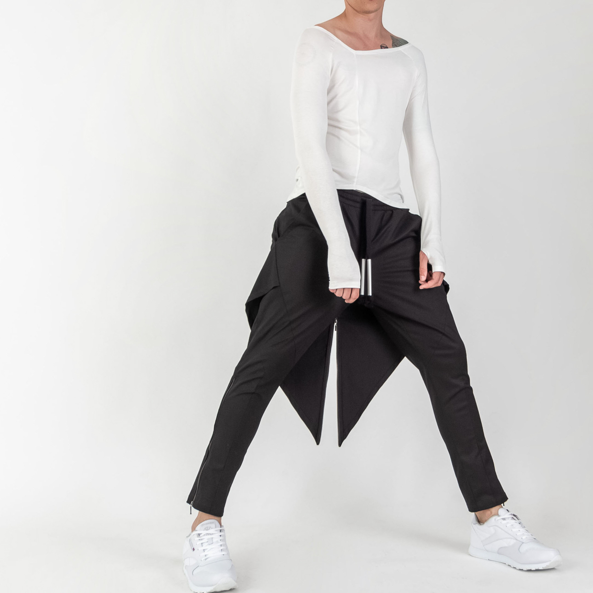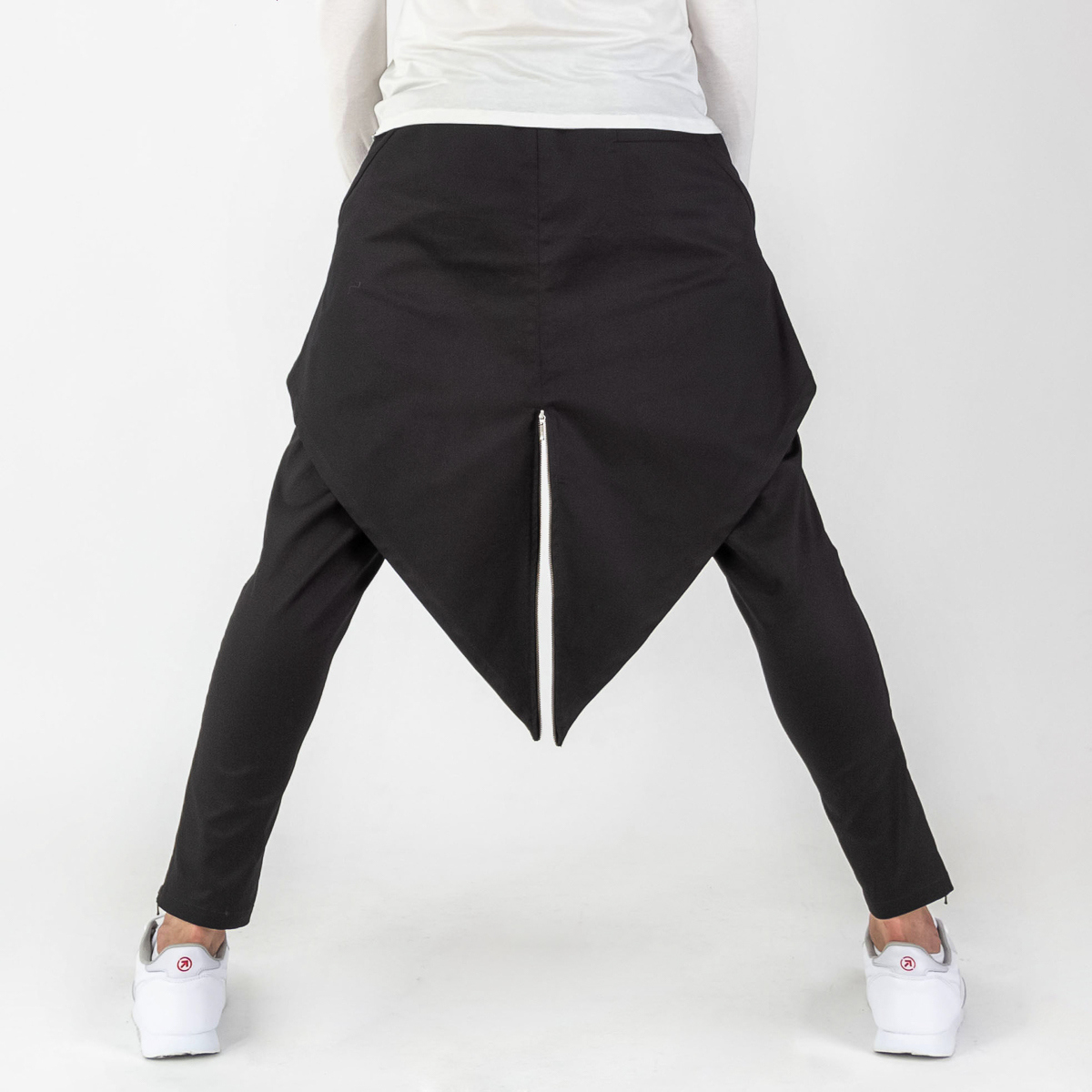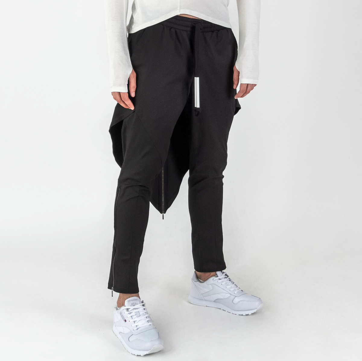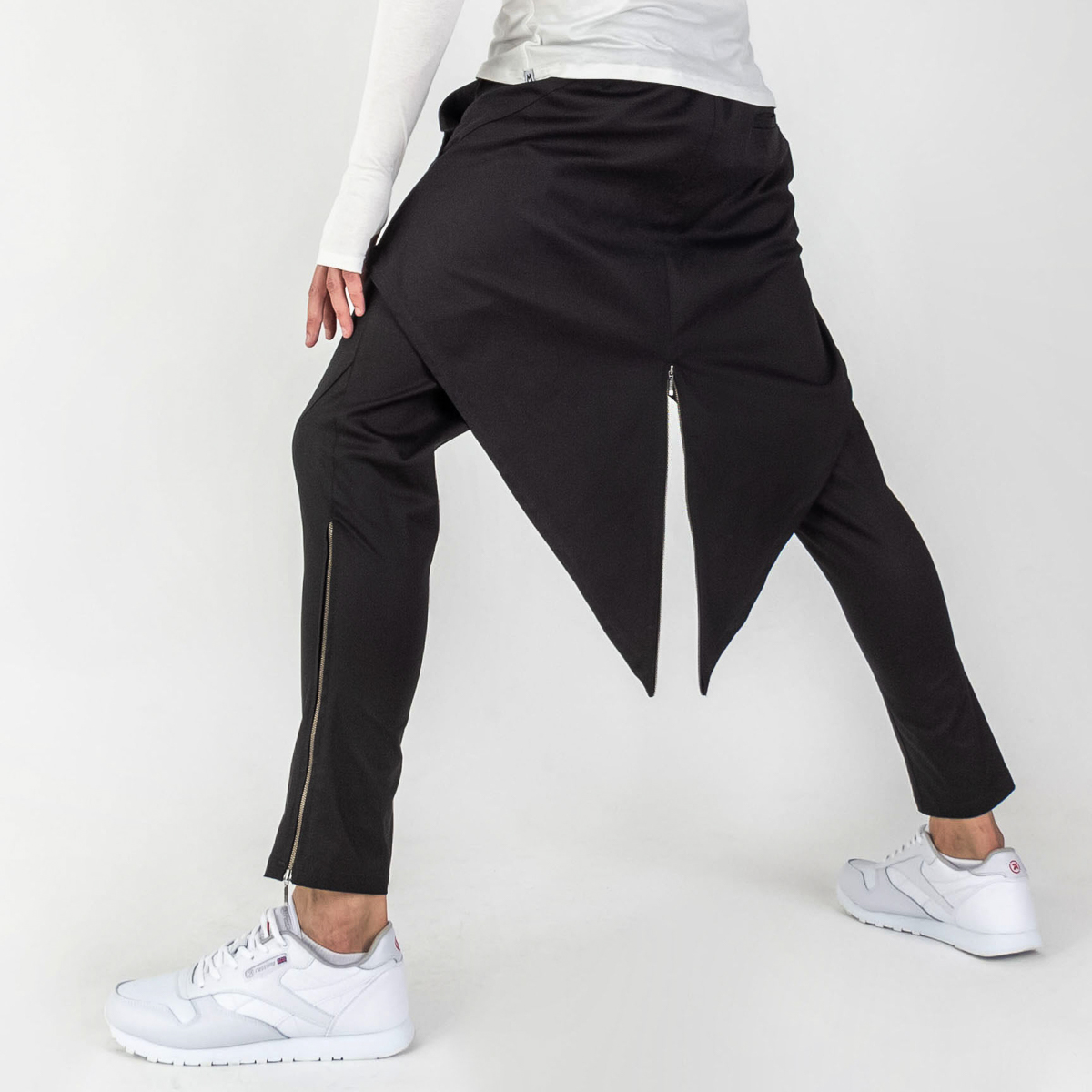 Архітектурні брюки зі спідницею унісекс на резинці. Мають кармани в бокових швах, об’ємні шнурки з алюмінієвими накінечниками, молнію на спідниці позаду та молнії по боках брючин.